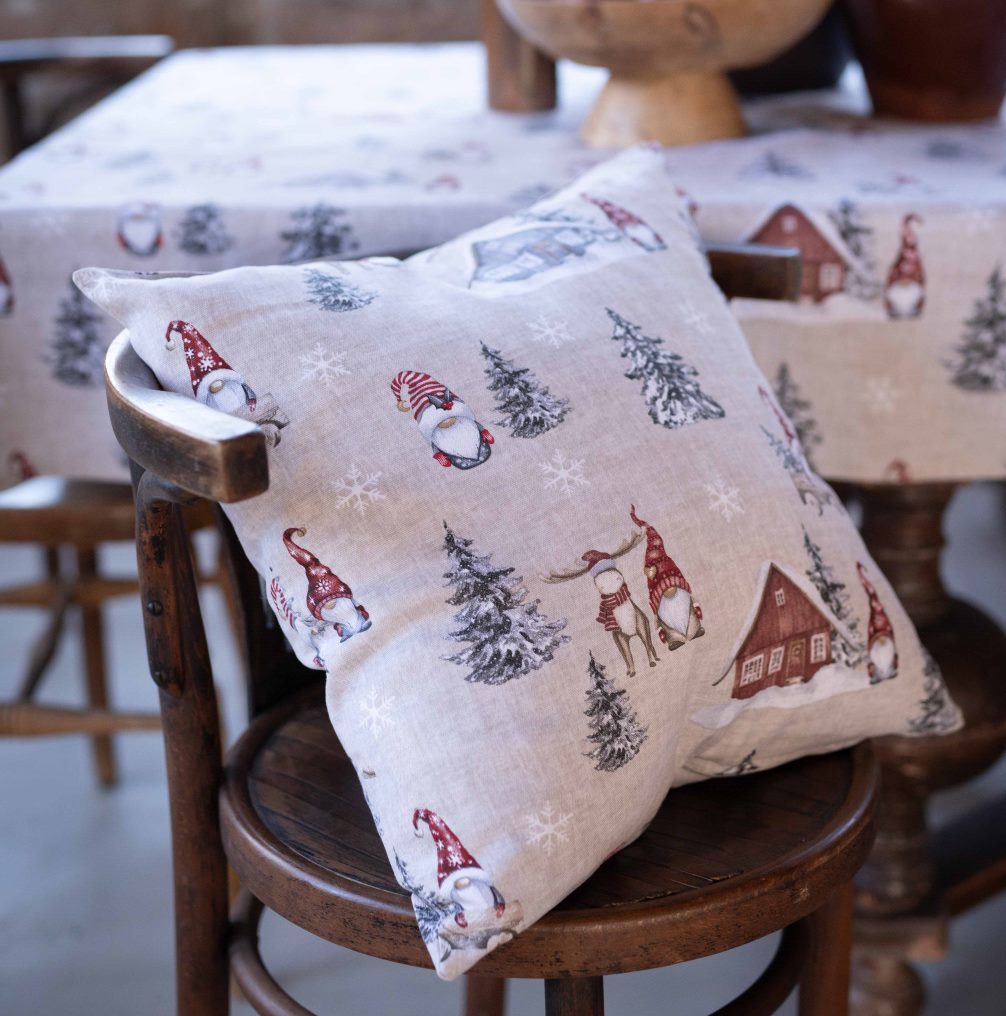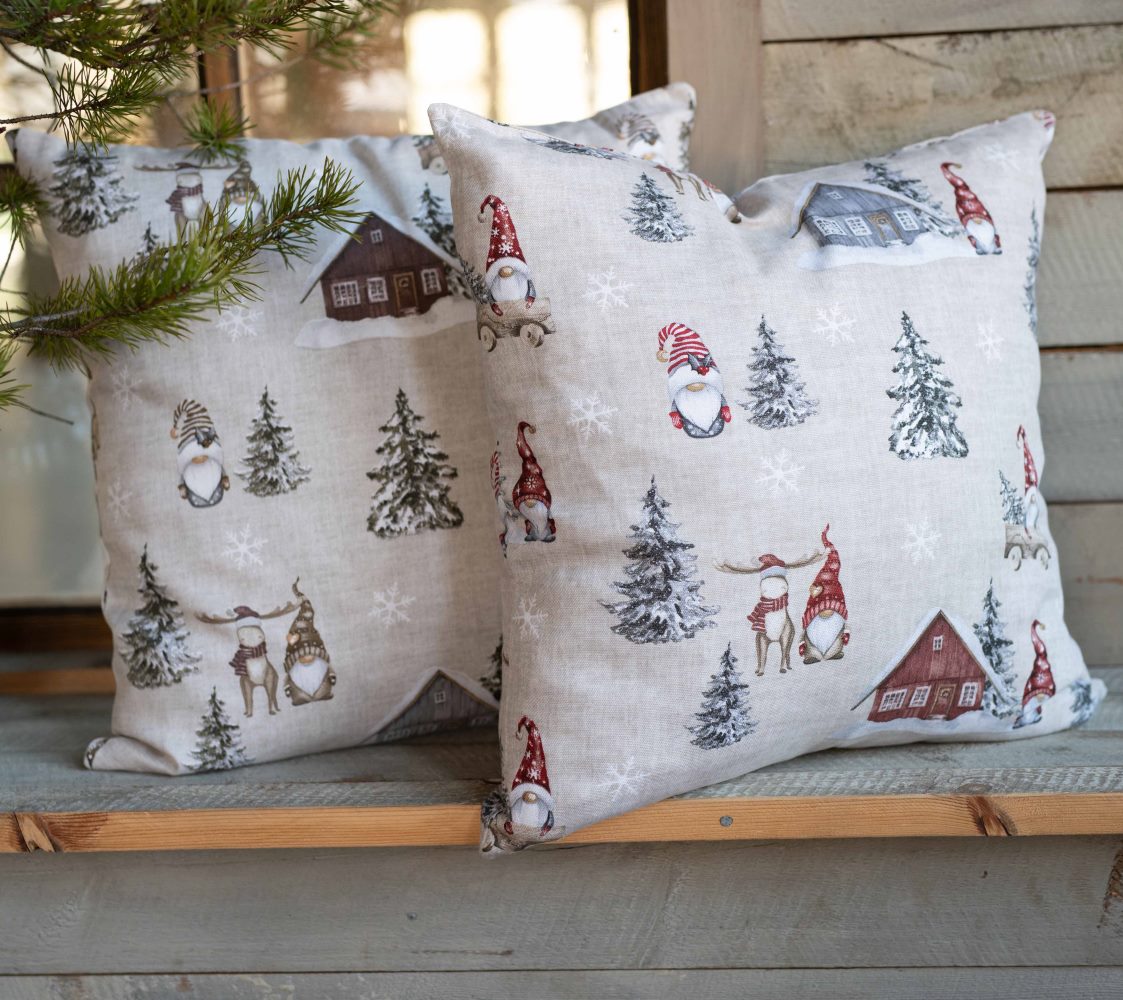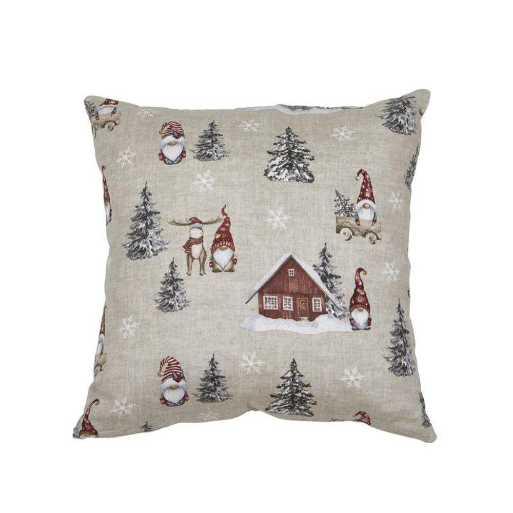 Kuddfodralet Harald röd från Fondaco är tillverkat i 100% bomull och har ett dekorativt och charmigt julmönster som blir en ljuvlig inredningsdetalj. Motivet visar tomtar, röda stugor, snöklädda granar och fallande snöflingor mot en rustik beige bakgrund. Kuddfodralet är liksidigt, med samma fina motiv på både fram- och baksidan. Storlek: 48x48 cm.
