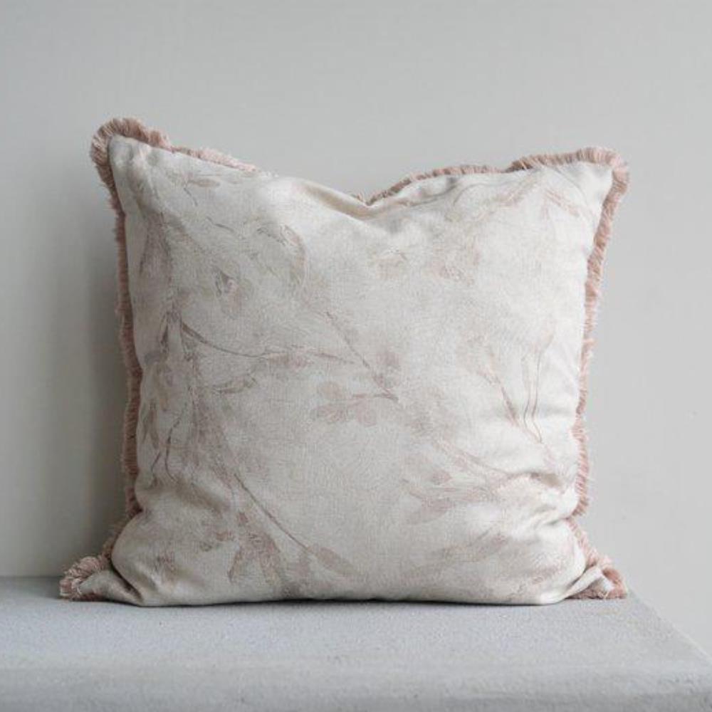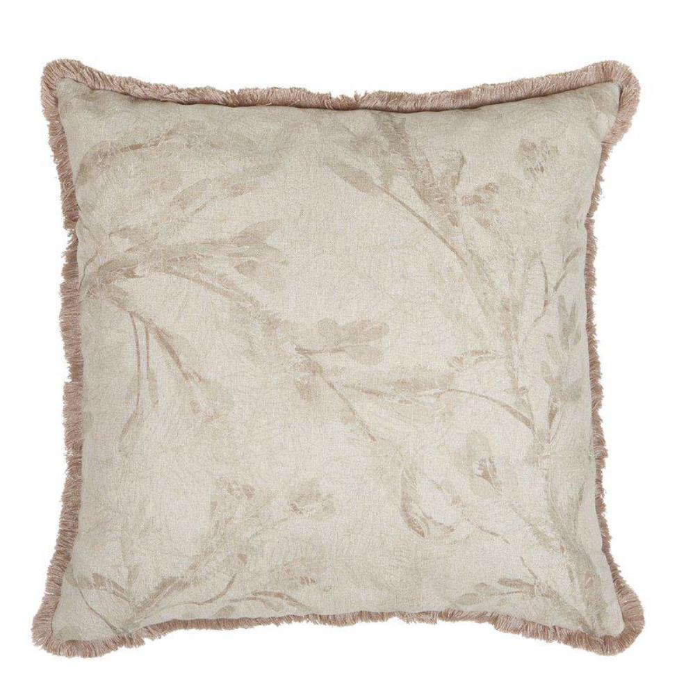 Kuddfodral Elaine från Fondaco med ett vackert mönster av blommor och blad i linfärgat som ger en mjuk och naturlig känsla. En fin och dekorativ frans ramar in kuddfodralet och bidrar till en elegant helhet. Storlek: 47x47 cm.
