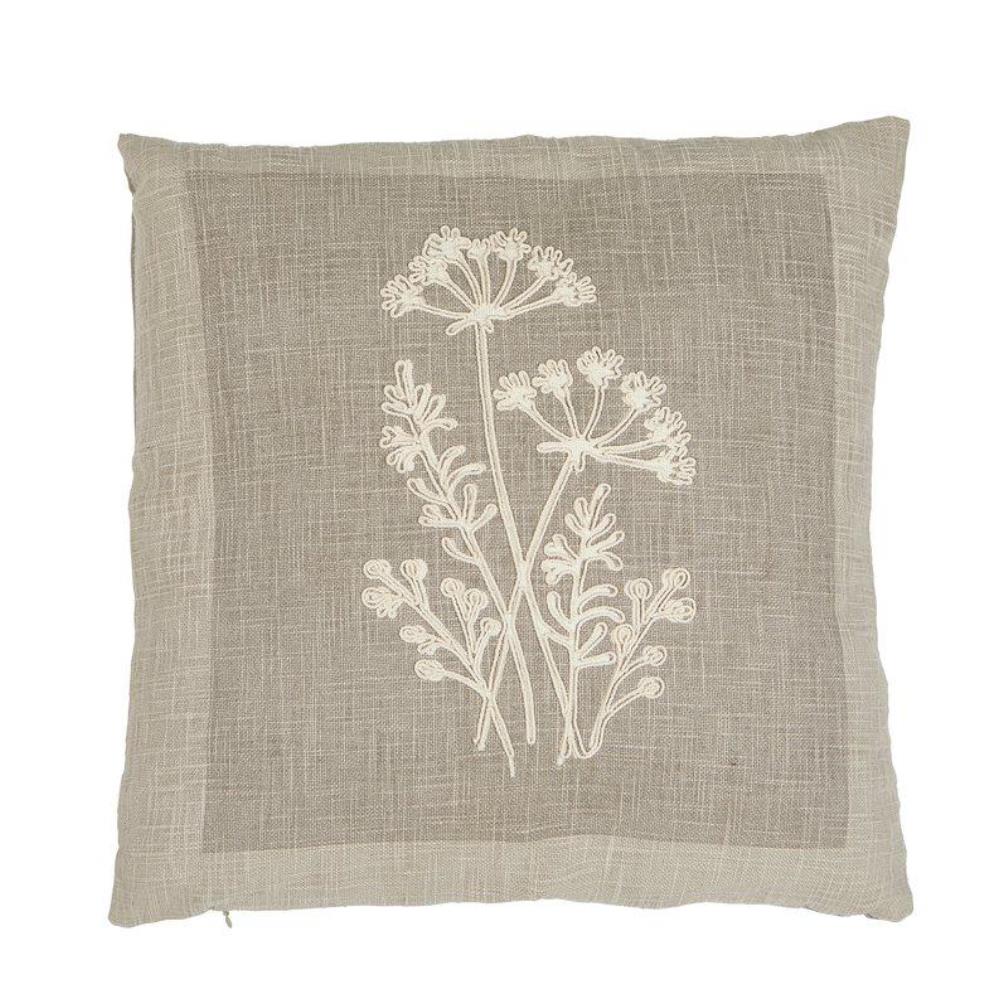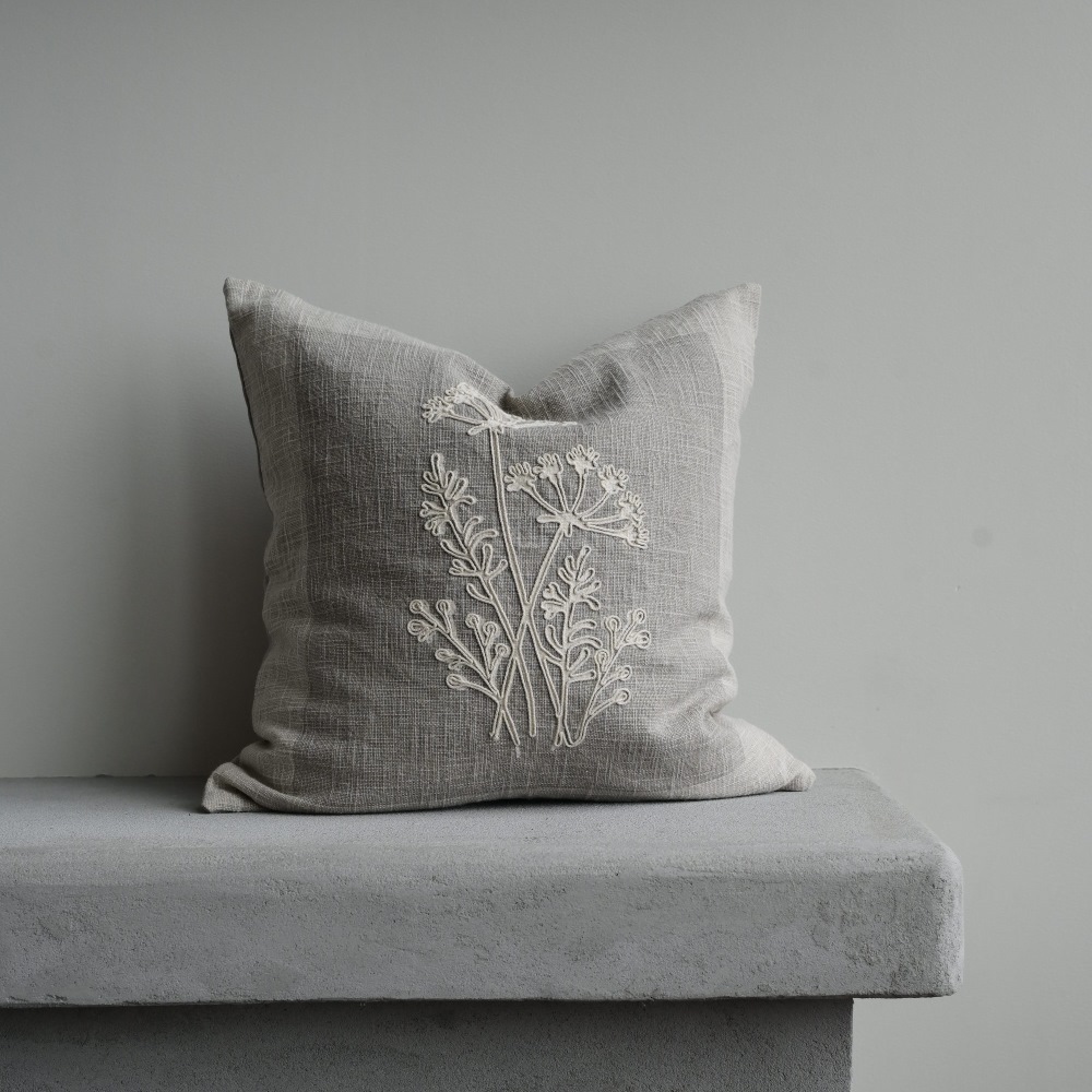 Kuddfodral Laura från Fondaco i grov bomullsslub med en linfärgad framsida som har ett tryckt mönster i botten och ett vackert ljust broderi ovanpå. Det ger både djup och en fin hantverkskänsla. Baksidan är enfärgad, vilket gör kuddfodralet lätt att kombinera med andra kuddar. Perfekt för dig som vill skapa en ombonad, naturlig och stilren inredning med textilier i jordnära toner. Storlek: 48x48 cm.