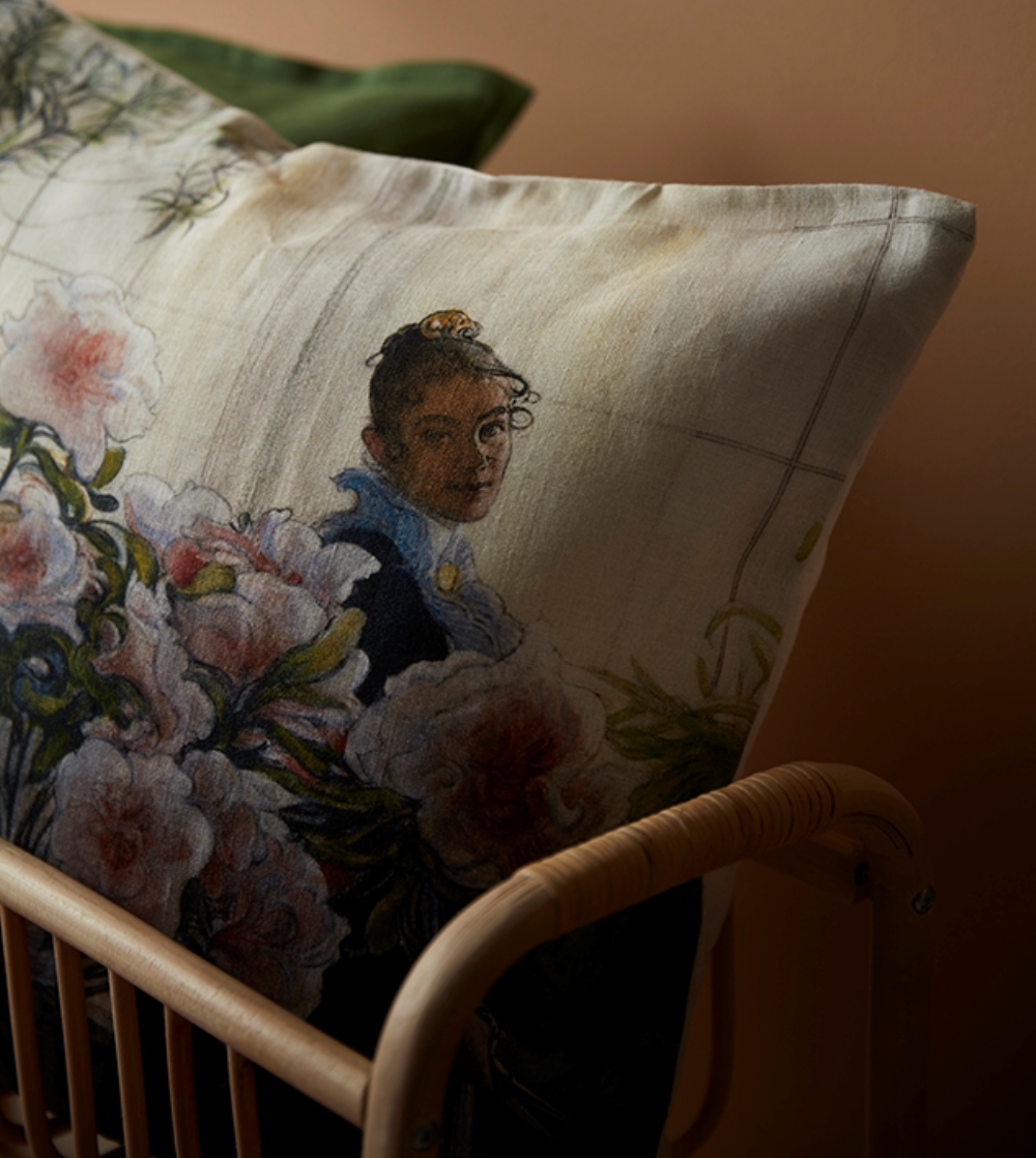 Kuddfodral Azalea från Svanefors med ett motiv hämtat från Carl Larssons ikoniska målning "Azalea", där vackra blommor möter en tidlös hemkänsla. Kuddfodralet är tillverkat i 100% linne som ger en levande struktur och en genuin känsla.