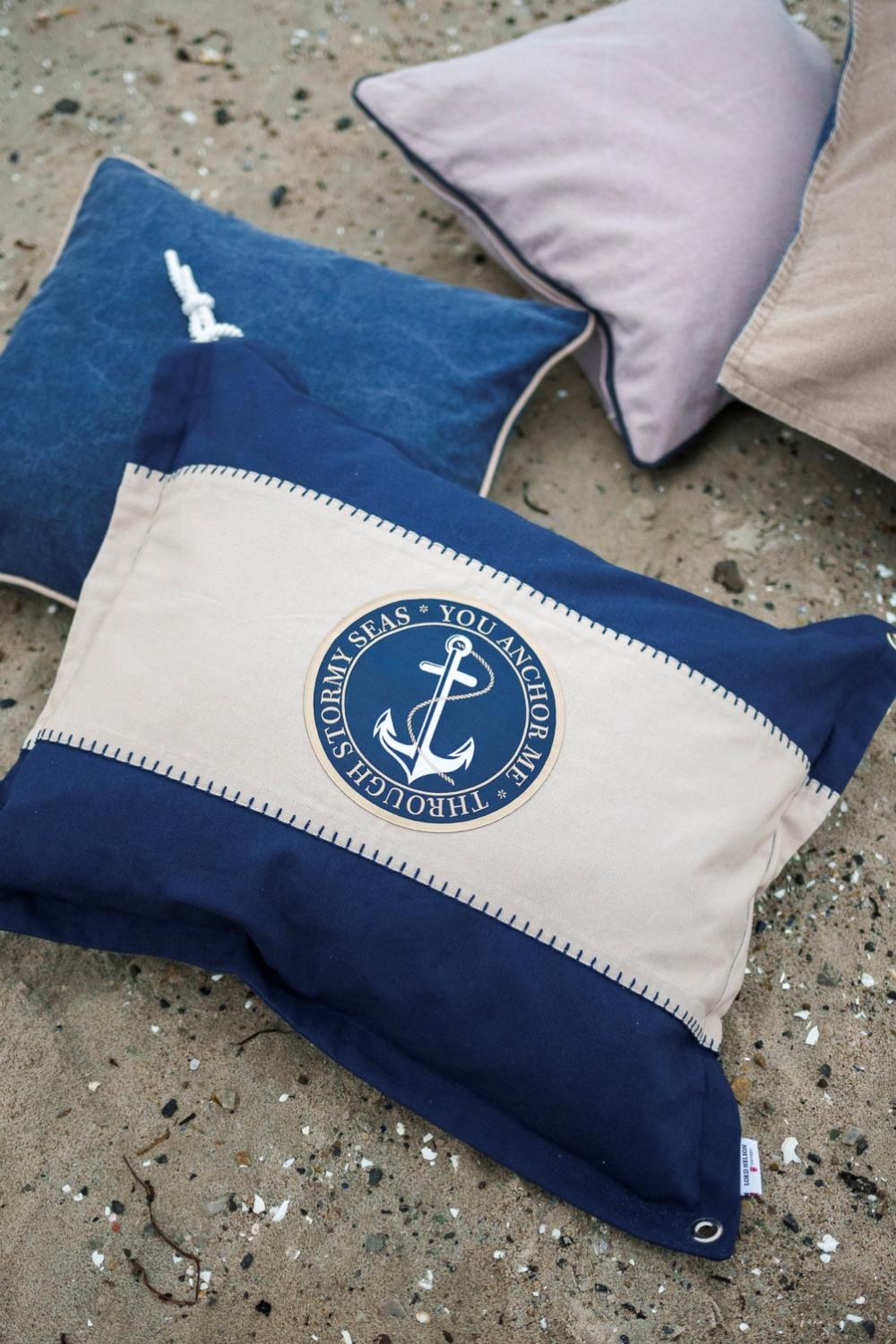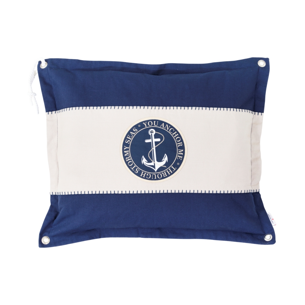 Kuddfodral Bojardalen från Lord Nelson Victory i bomull med maritim känsla i naturvitt och marinblått. Det klassiska ankarmotivet i mitten ger en tidlös design som passar perfekt i både sommarstugan och hem med havstema.