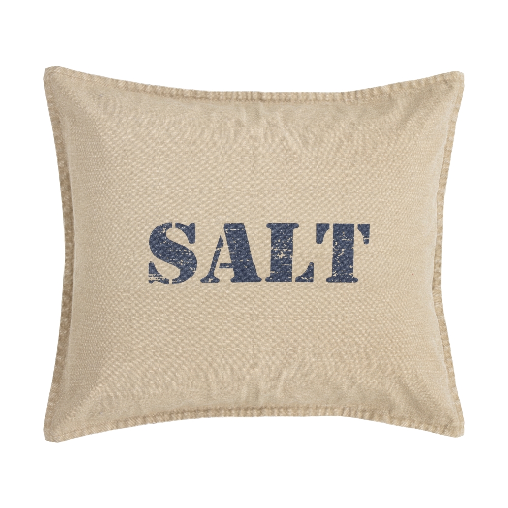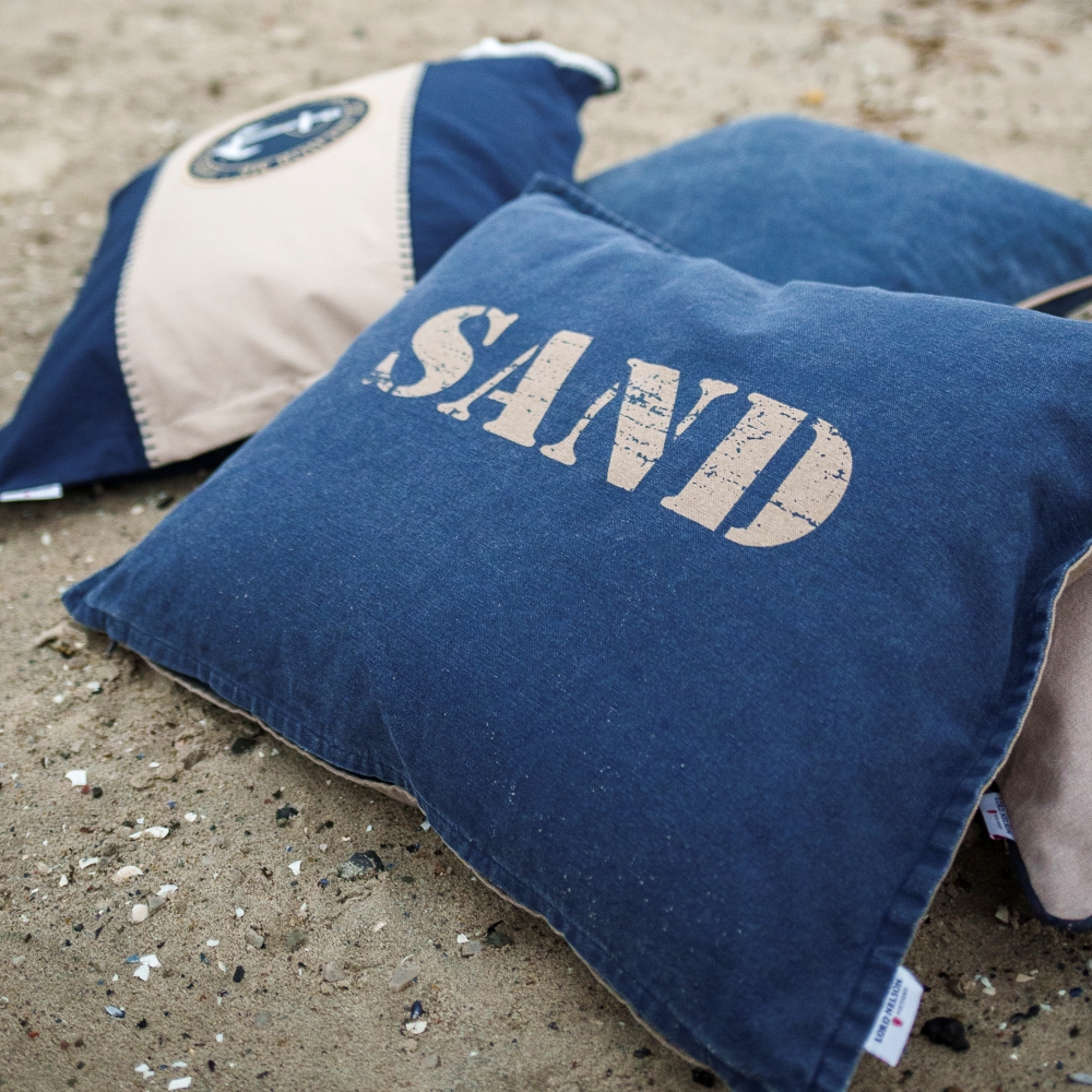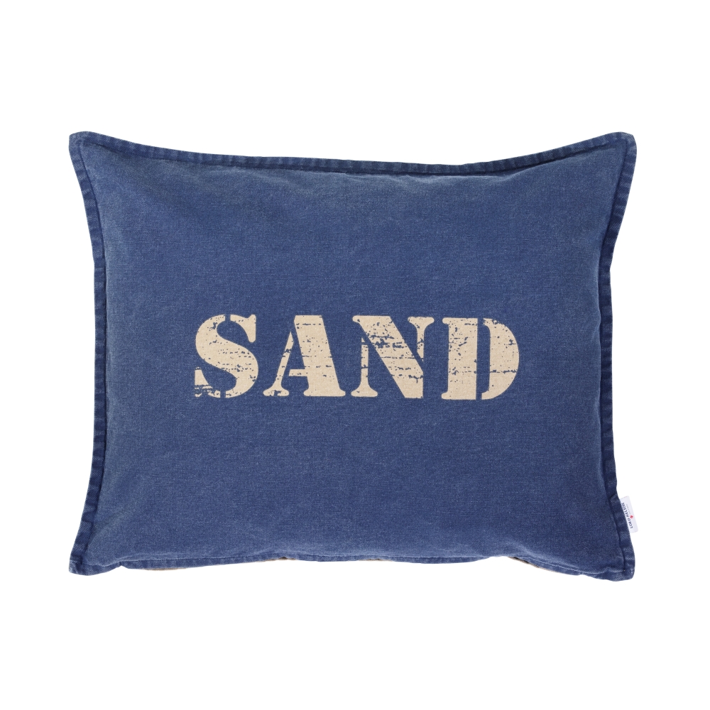 Ett stilrent kuddfodral i kraftig bomull med tydlig maritim känsla. Den vändbara designen ger två olika uttryck med texten “Sand” mot en marinblå botten på ena sidan och “Salt” mot en beige botten på den andra.