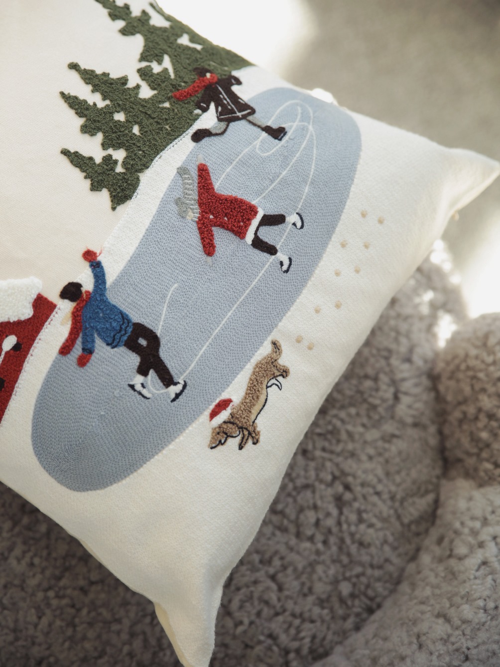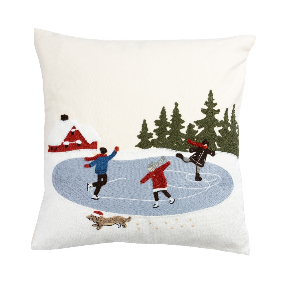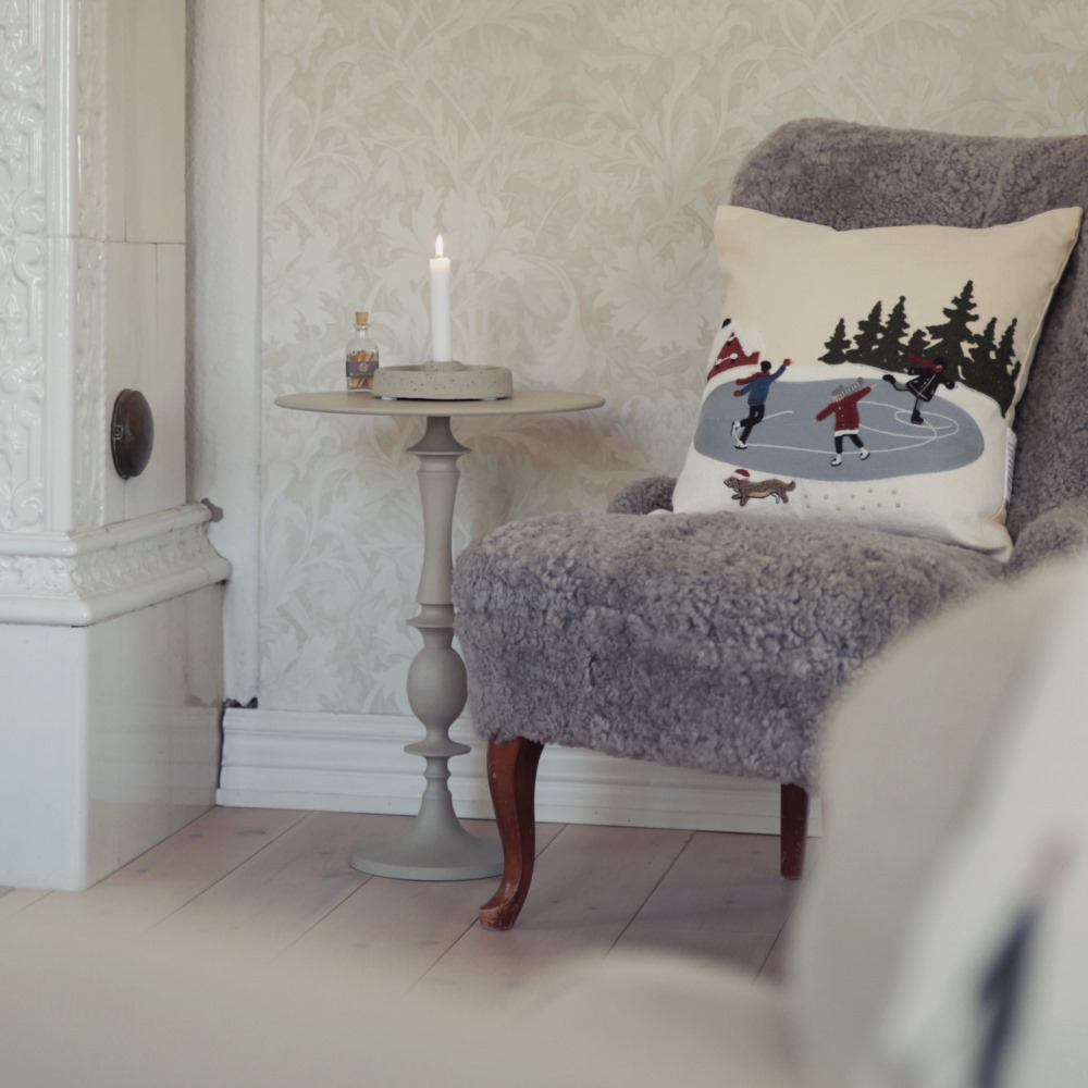 Kuddfodral Kate från Svanefors har ett vintrigt broderi i flera färger med charmiga skridskoåkare på framsidan. Baksidan är tillverkad i ett kraftigt bomullstyg som ger stadga och en rustik känsla. Ett dekorativt och stämningsfullt inslag i vinterns inredning. Storlek: 45x45 cm.
