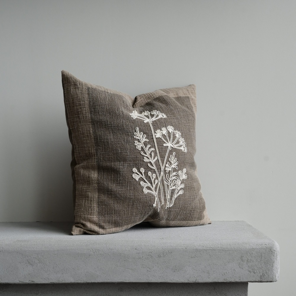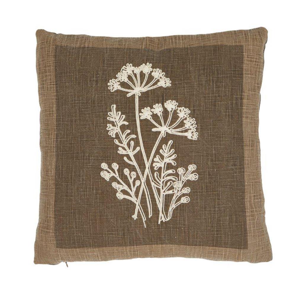 Kuddfodral Laura från Fondaco i grov bomullsslub med en nougatfärgad framsida som har ett tryckt mönster i botten och ett vackert ljust broderi ovanpå. Det ger både djup och en fin hantverkskänsla. Baksidan är enfärgad, vilket gör kuddfodralet lätt att kombinera med andra kuddar. Perfekt för dig som vill skapa en ombonad, naturlig och stilren inredning med textilier i jordnära toner. Storlek: 48x48 cm.