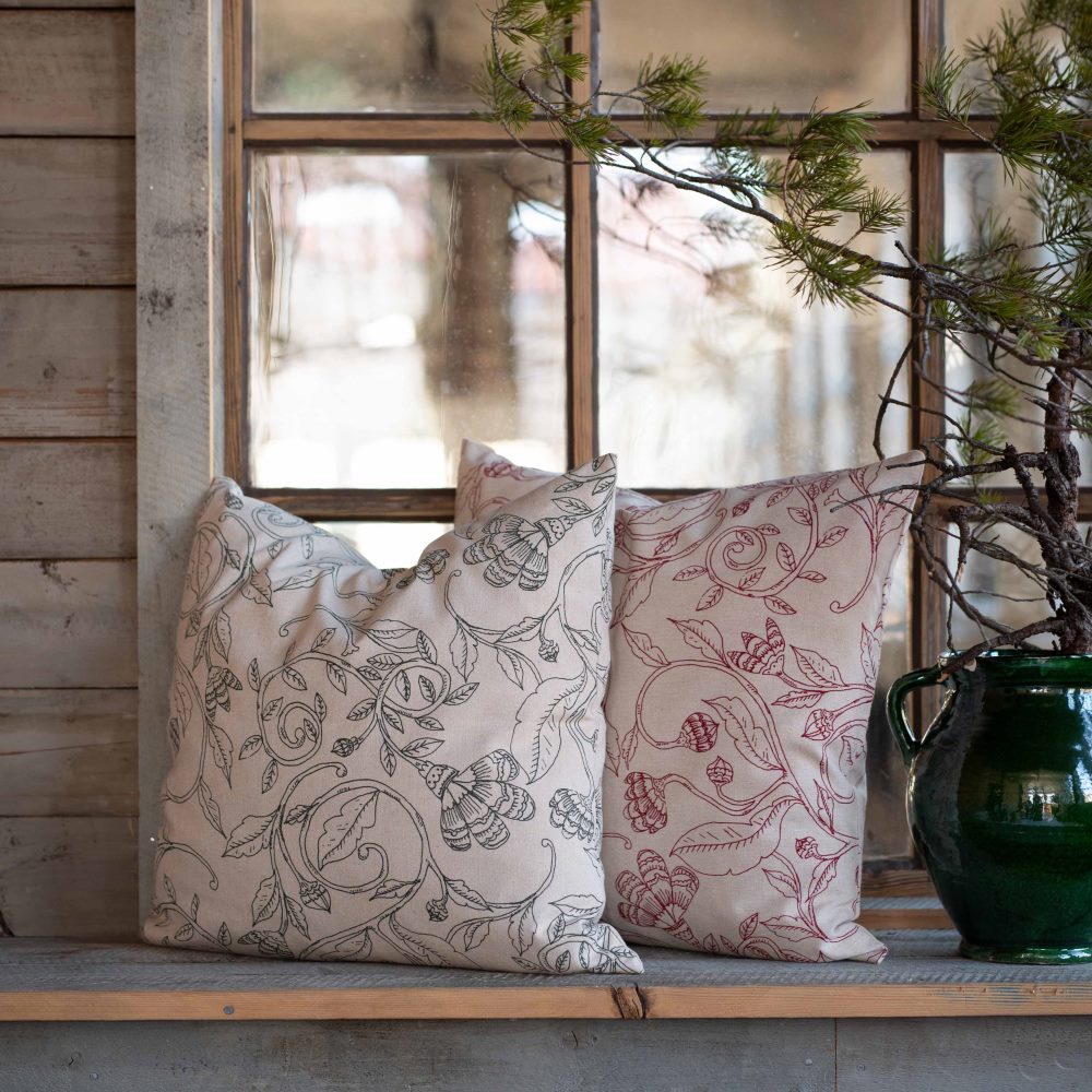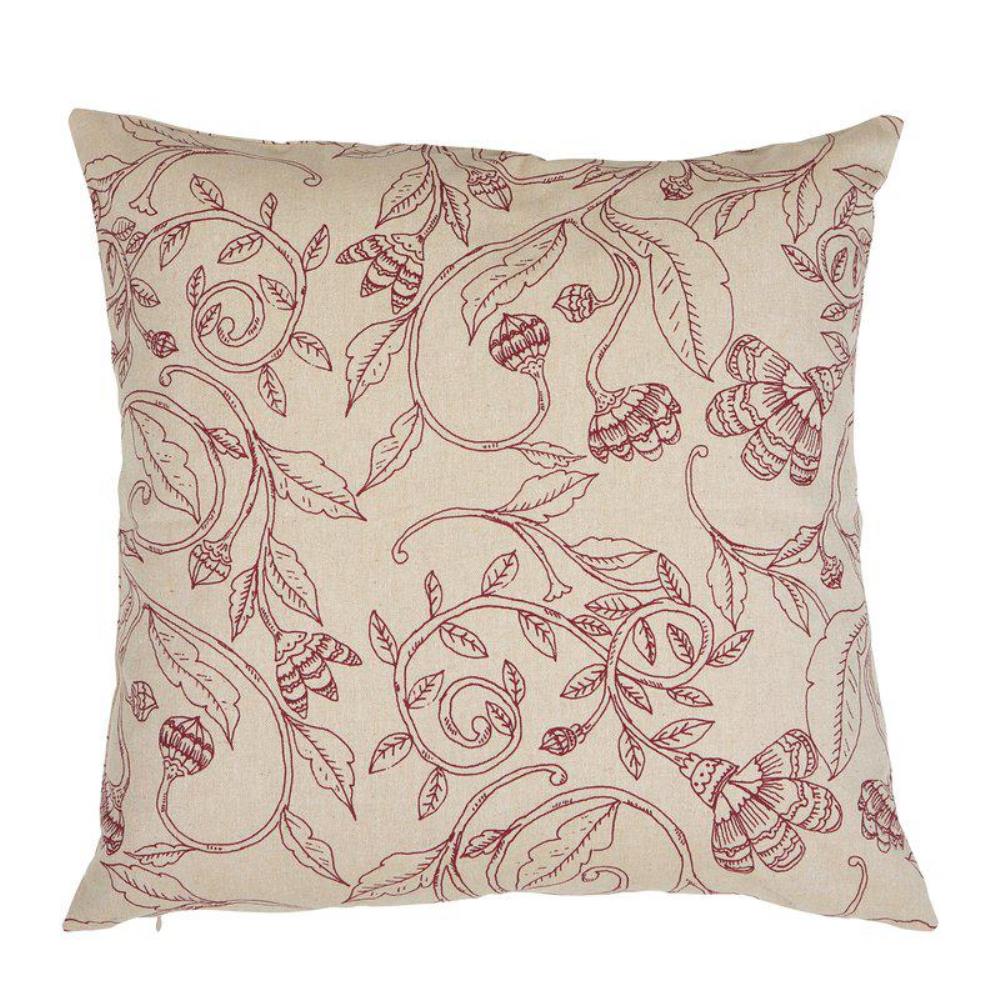 Kuddfodral Ellie från Fondaco med en vacker design som är tillverkad av 80% bomull och 20% övriga återvunna material. Det stilfulla, snirkliga mönstret i rött mot den ljusa botten skapar en harmonisk och elegant känsla. Storlek: 48x48 cm.