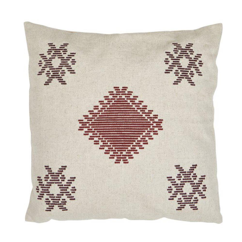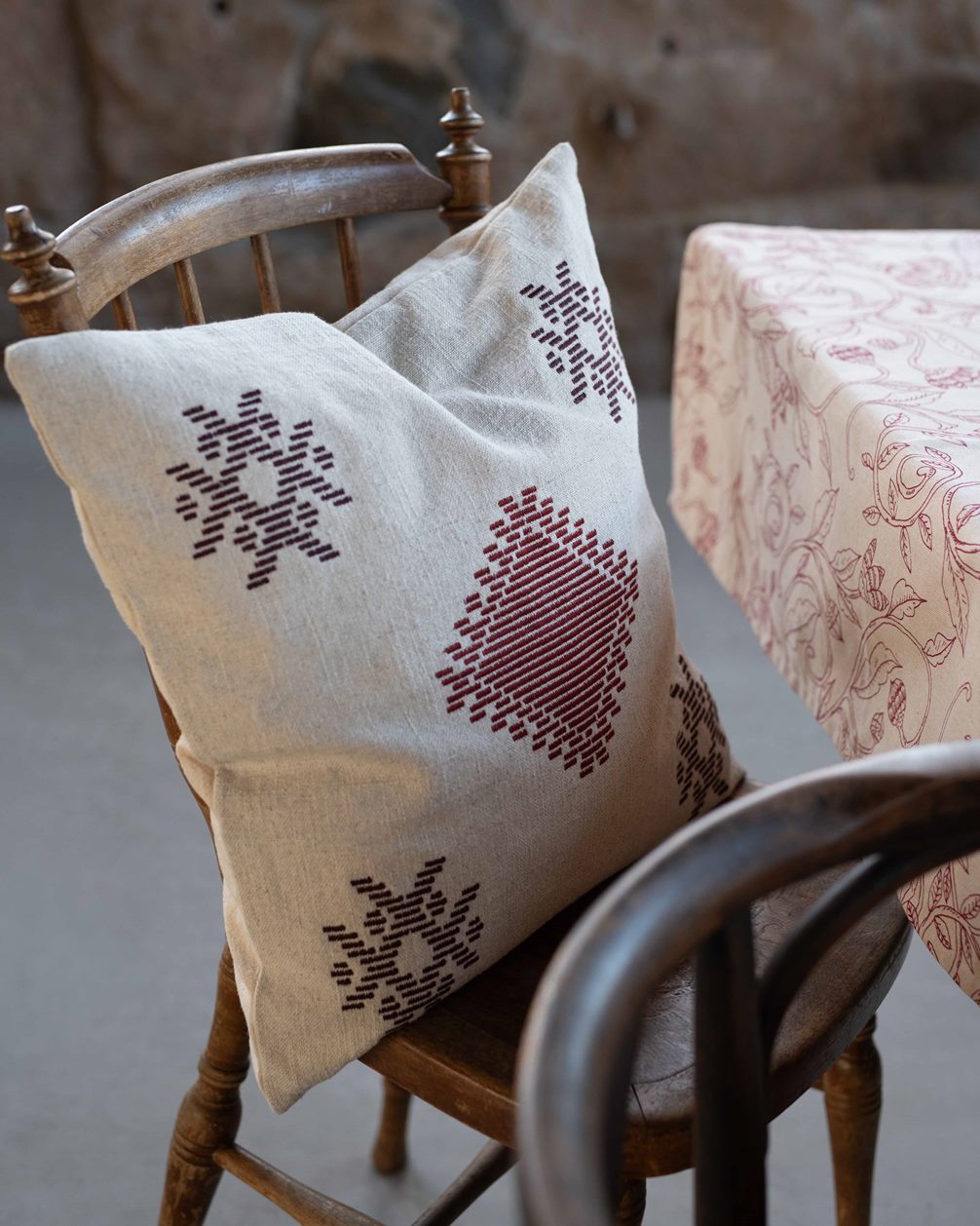 Kuddfodral Ike från Fondaco i en vacker blandning av bomull och linne – en kombination som ger en naturlig och något rustik känsla med en sofistikerad touch. Den mjuka bomullen möter linets tydliga struktur och skapar en fin balans mellan komfort och karaktär. Det broderade röda mönstret tillför ett stilrent uttryck och en handgjord känsla som lyfter inredningen. Storlek: 50x50 cm.