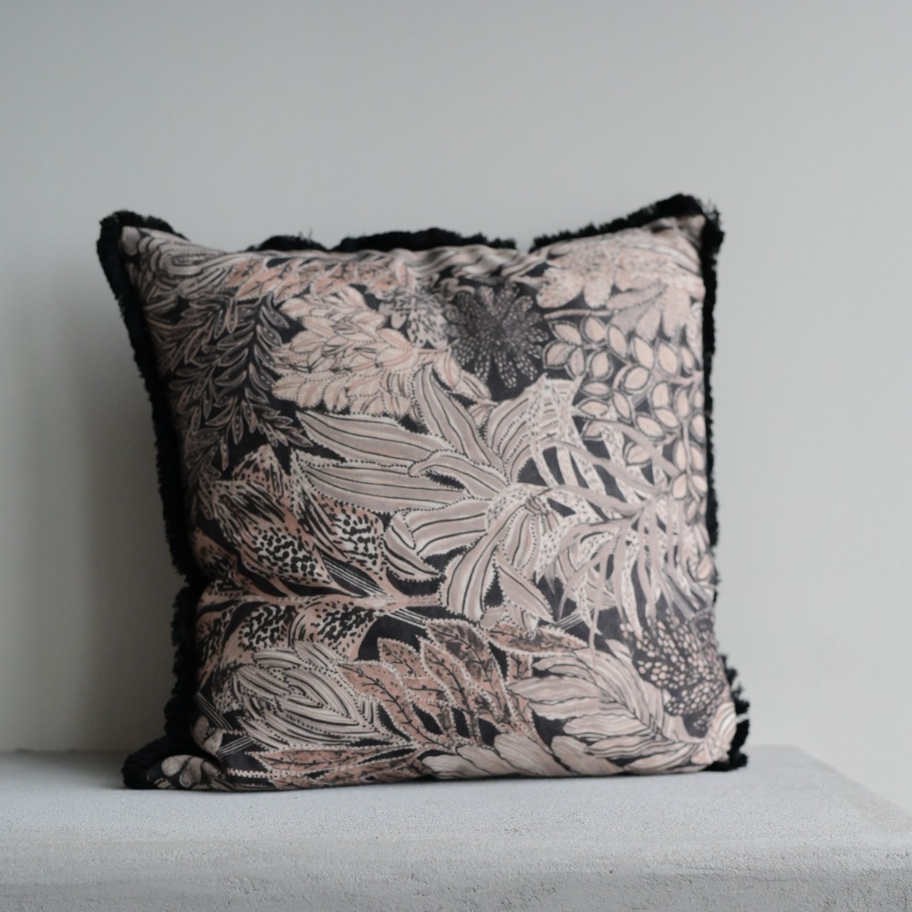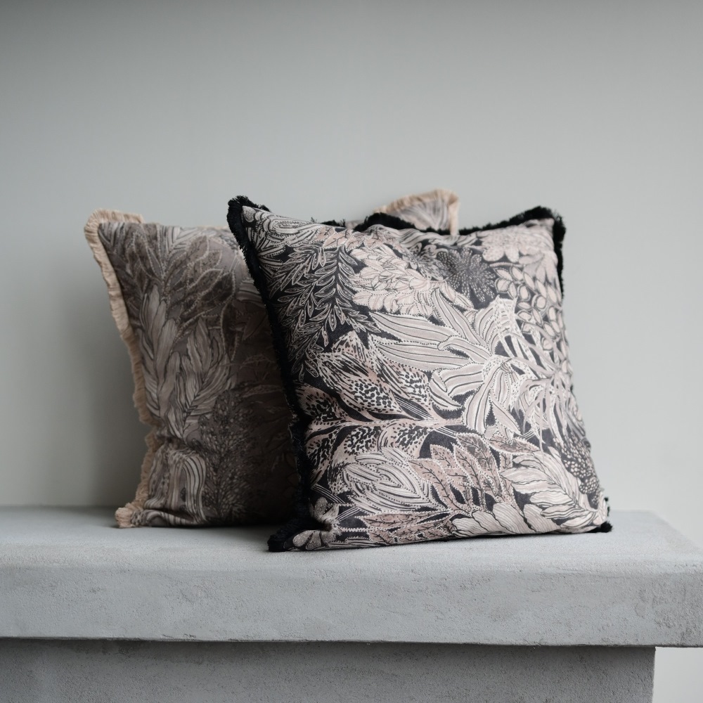 Kuddfodral Farah från Fondaco med ett stort bladmönster som genast fångar blicken. De jordnära nyanserna i kombination med svart skapar en behaglig och harmonisk känsla samtidigt som mönstret tillför rummet en känsla av naturlig elegans. Runt kuddfodralet löper en nätt frans som blir en extra fin detalj. Storlek: 47x47 cm.