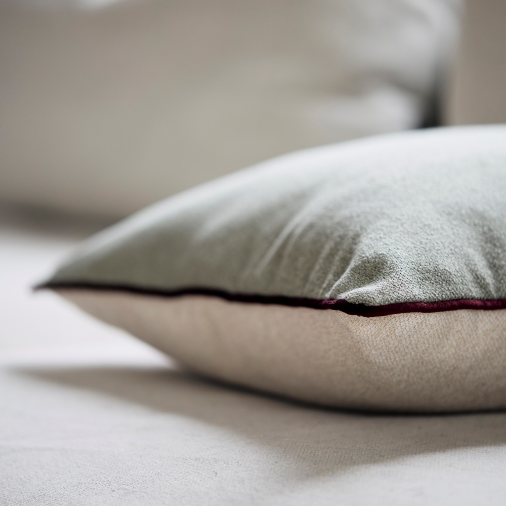 Kuddfodral Todd 45x45 cm från Svanefors har en stilren mossgrön framsida med en ljus bakgrund och dekorativ färgad piping. Kombinationen av färg och detaljer skapar ett elegant och ombonat uttryck som lyfter både soffan och sängen. Dragkedja i nederkant.