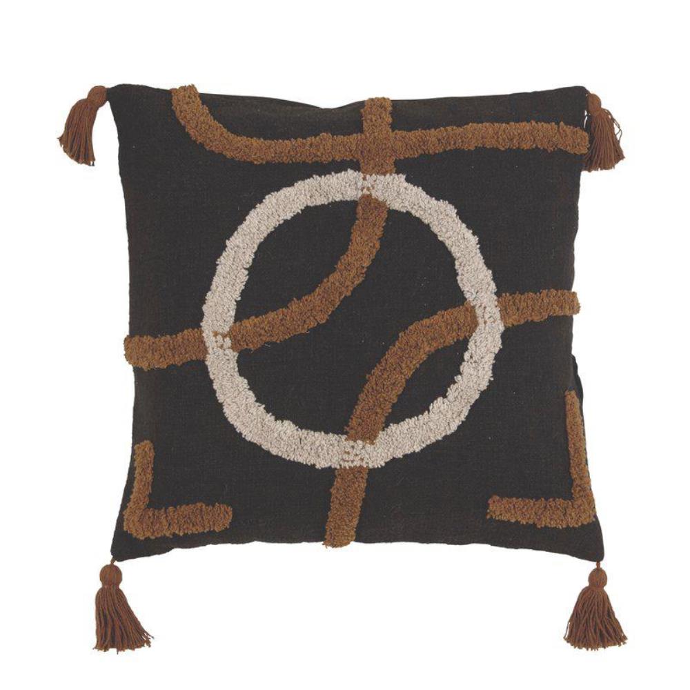 Kuddfodral Troy från Fondaco är tillverkat i svart bomull och har ett modernt, tuftat mönster i harmoniska jordnära nyanser. De dekorativa tofsarna i hörnen ger ett lekfullt men stilren touch som sticker ut i inredningen.
