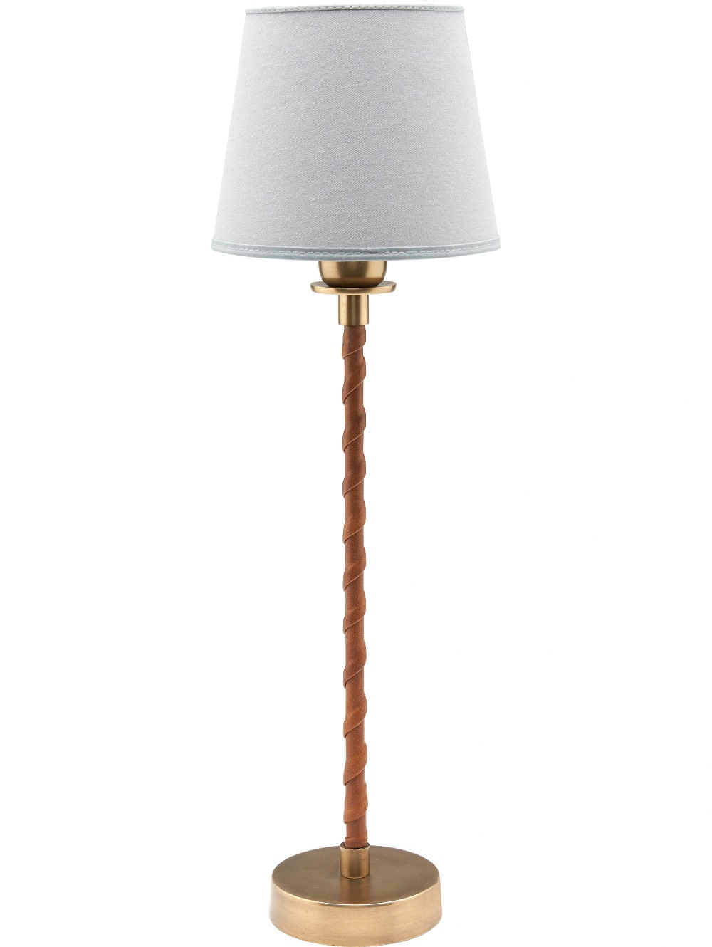 Lampfot Nora från PR Home har en tidlös design med en stomme i metall i antikmässing. Detaljen med konstläder virat runt stommen ger ett elegant och vackert uttryck. Lampfotens vackra och enkla design gör att den passar i de flesta hem och inredningsstilar. Den levereras med en 1,6 meter svart textilsladd med strömbrytare. Höjd 46 cm och bredd och djup 11 cm. Till Nora rekommenderas en ljuskälla med E27 sockel, max 40W. Passar med en skärm upp till cirka 20 cm i diameter. Ljuskälla ingår ej.