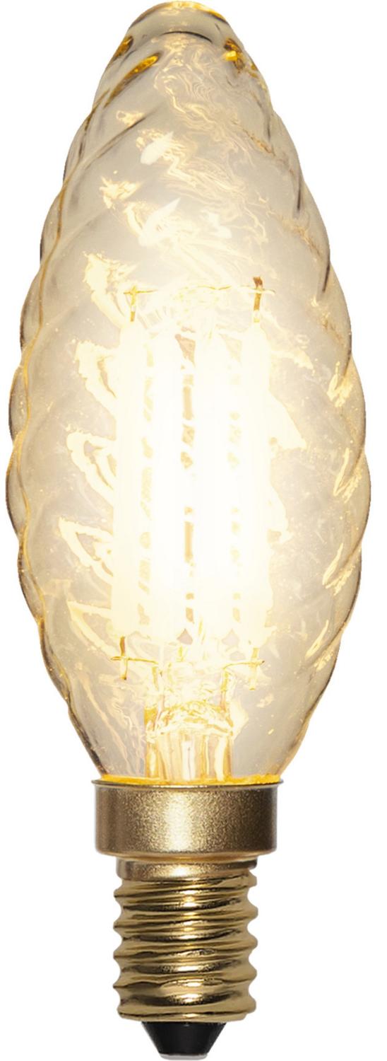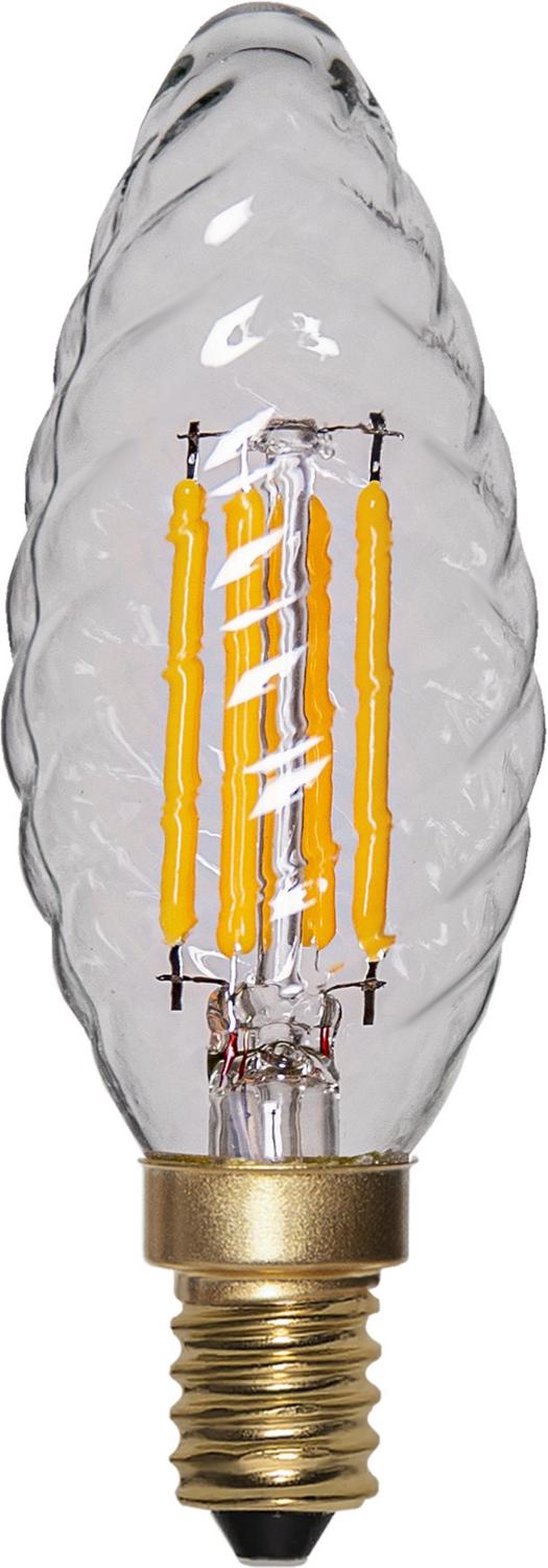 Kronljuslampa från Star Trading har klart, vridet glas som sprider ett varmt och mjukt sken med färgtemperatur 2100K. Ljuskällan har E14-sockel och är dimmerkompatibel, vilket gör det enkelt att reglera ljusstyrkan. Perfekt för ljuskronor och lampetter som vill skapa en ombonad och elegant atmosfär.
