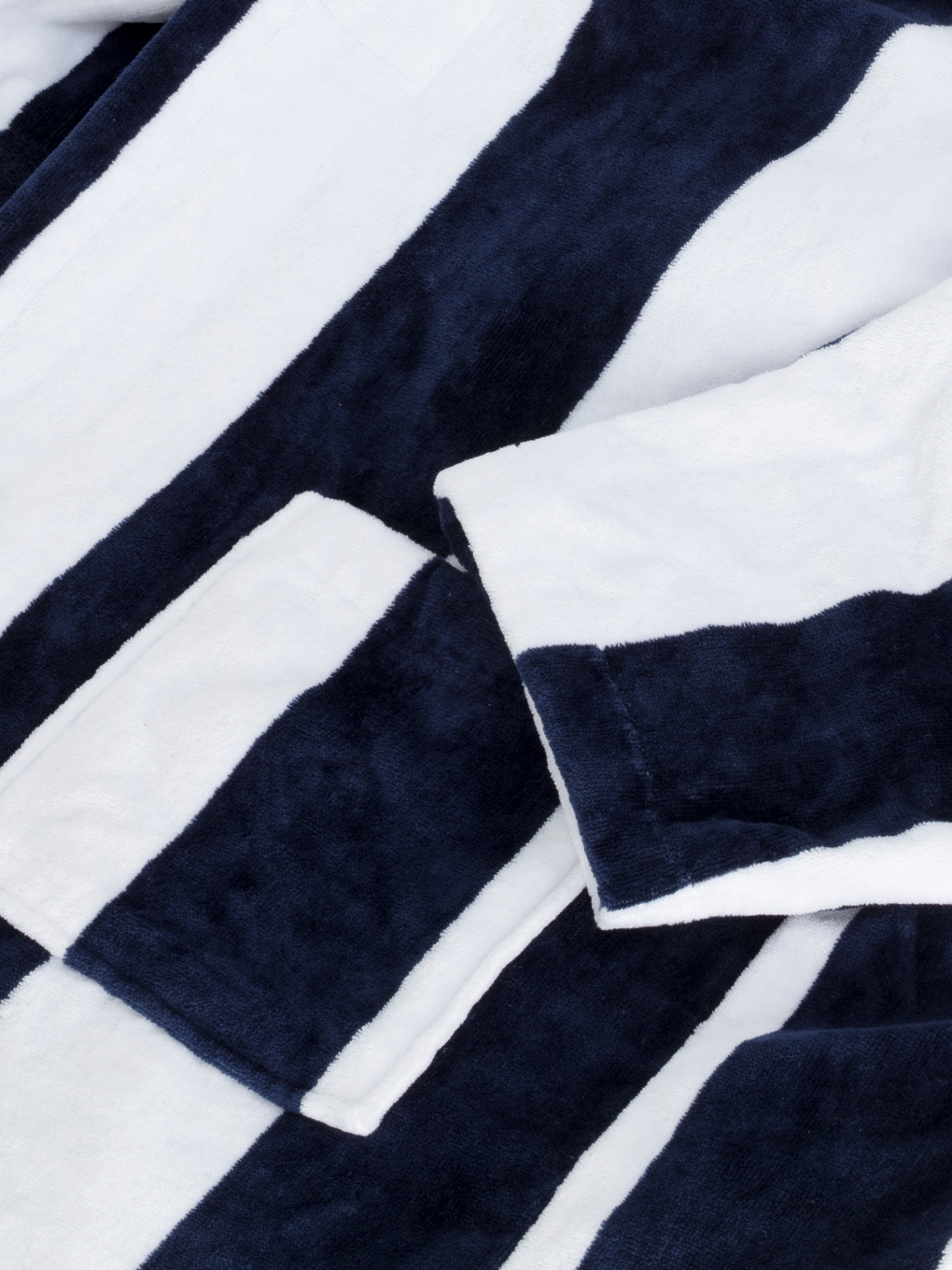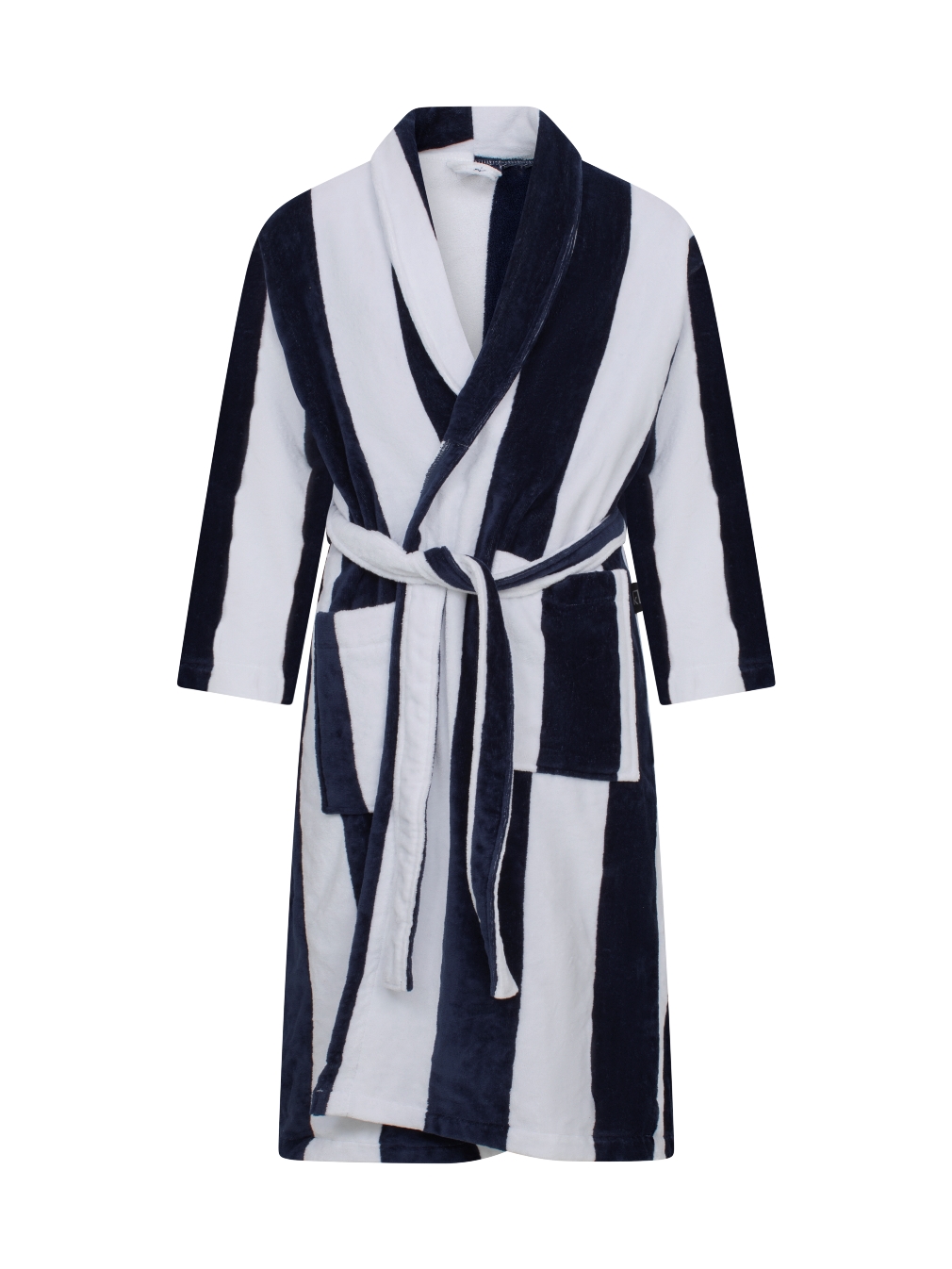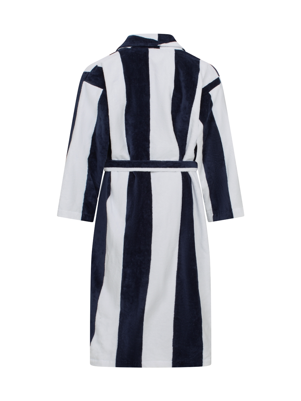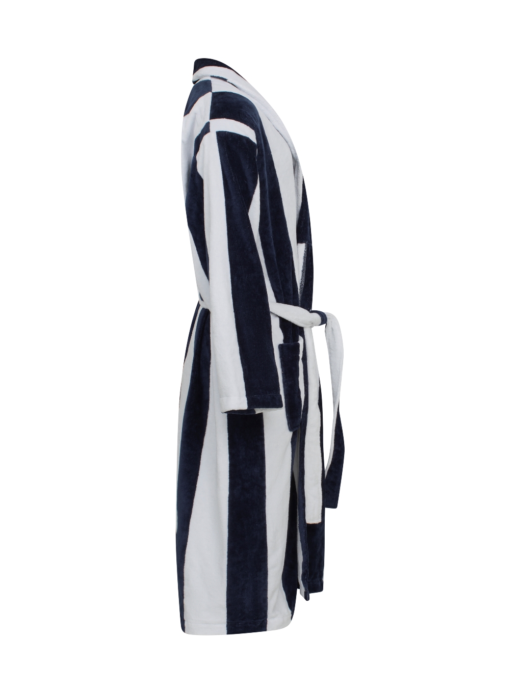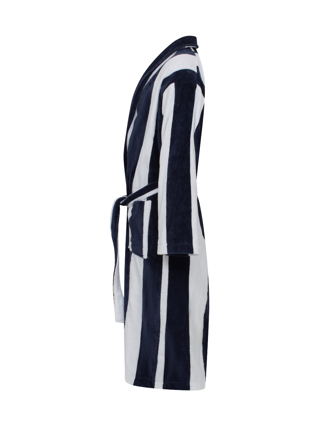 En elegant morgonrock från Kosta Linnewäfveri i mjuk och skön bomullsvelour. Badrocken har breda, vertikala blockränder i en klassisk maritim kombination av vitt och marinblått. Den har en bred krage med välgjorda detaljer som ger en lyxig känsla. Produkten är certifierad enligt OEKO-TEX® STANDARD 100, fri från skadliga ämnen. Storlek: L/XL.