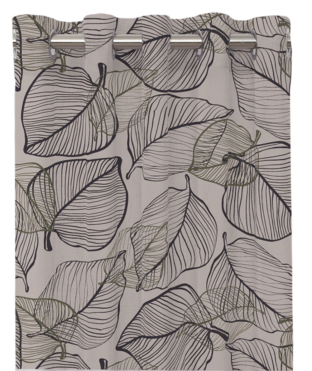 Gardin Hugo från Redlunds har ett härligt mönster av stora, grafiska löv. Löven är i två olika färger, med mörka, nästan svarta linjer och en mjuk, dämpad grön ton på en linnebeige botten som ger en modern och harmonisk känsla i rummet. Passar i alla hem där du vill kombinera grafiskt mönster med jordnära elegans.