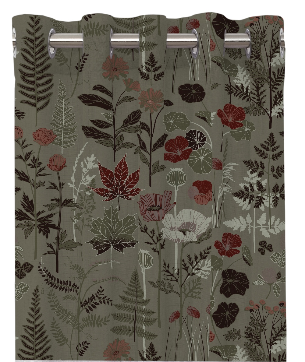 Öljettgardin Trädgård från Redlunds har ett elegant trädgårdsinspirerat mönster med blommor i mörkt rött, rosa och vitt samt vinröda och gröna blad på en khakifärgad botten.