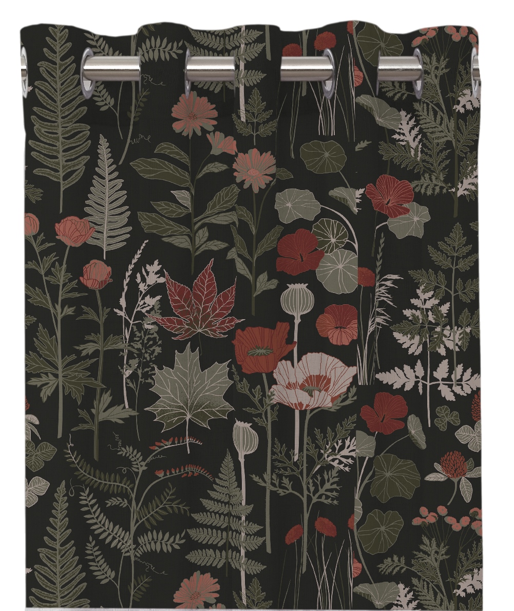 Öljettgardin Trädgård från Redlunds har ett varmt, jordnära trädgårdsmönster med blommor i dova röda och rosa toner samt gröna blad på en svart botten.