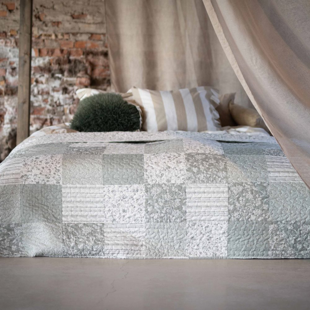 Överkast Verdi från Fondaco har en vacker quiltad design i lapptäckesteknik med ett harmoniskt mönster i milda gröna toner. Baksidan har ett charmigt småblommigt motiv på en offwhite botten, vilket gör att du enkelt kan variera utseendet. Den dekorativa quiltningen ger överkastet en fin struktur och gör det både praktiskt och stilfullt som är perfekt för att skapa en ombonad känsla i sovrummet. Storlek: 180x260 cm.