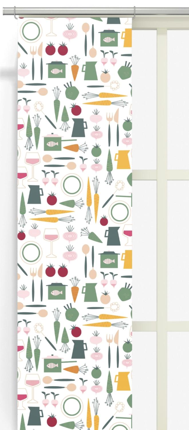 Panelgardin Dinner från Arvidssons Textil är tillverkad i bomull och designad av Nancy Bladfält. Panellängderna har ett stiligt 50-60-talsinspirerat grafiskt mönster med grönsaker, rotfrukter och köksredskap i grönt, gult och rosa. Perfekt för köksmiljöer där den tillför en tidlös och inbjudande atmosfär. Overlock nedtill. Storlek: 43x235 cm. Säljes i 2-pack.