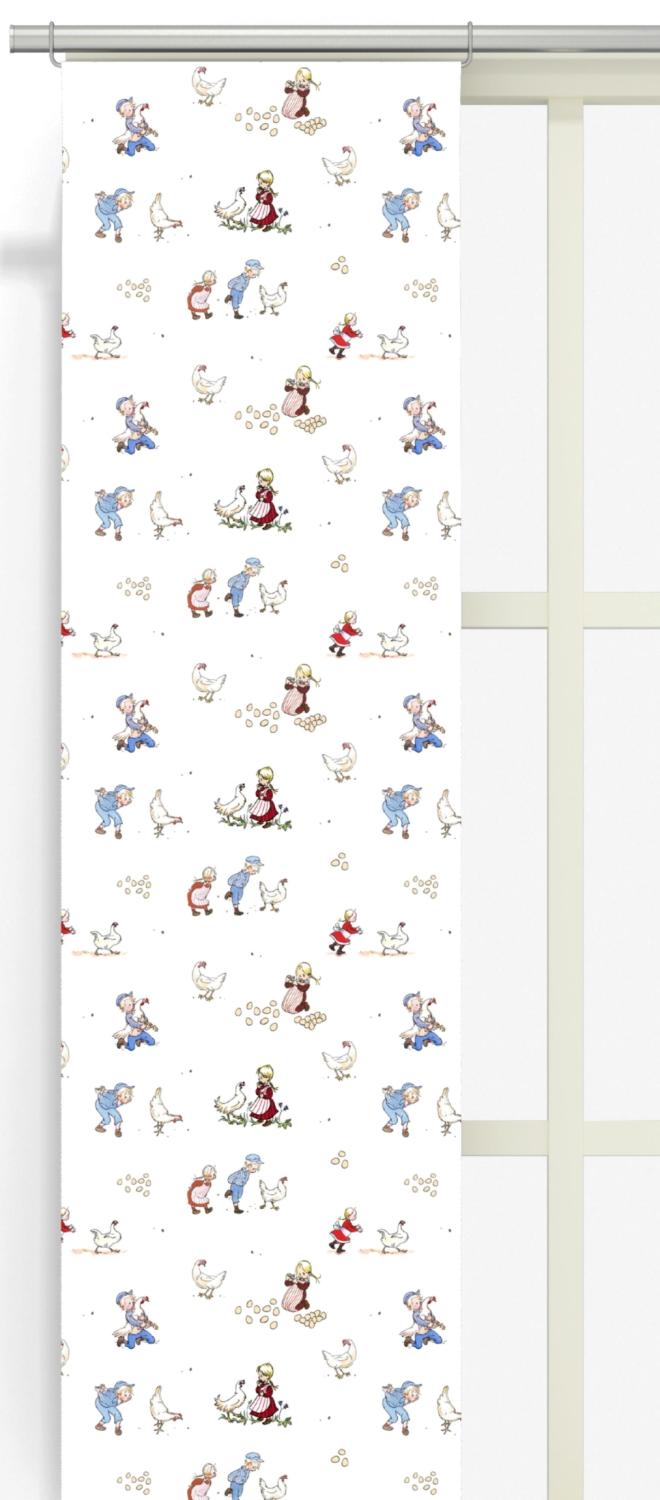 Panelgardin Emil & Ida i Hönsgården från Arvidssons Textil är tillverkad i 100% bomull med naturvit botten och ett charmigt motiv där Emil och Ida leker i hönsgården. Perfekt i barnrummet, lekhörnan eller köket där den lekfulla designen skapar en mjuk och hemtrevlig atmosfär. Overlock nedtill. Storlek: 43x240 cm. Säljes i 2-pack.