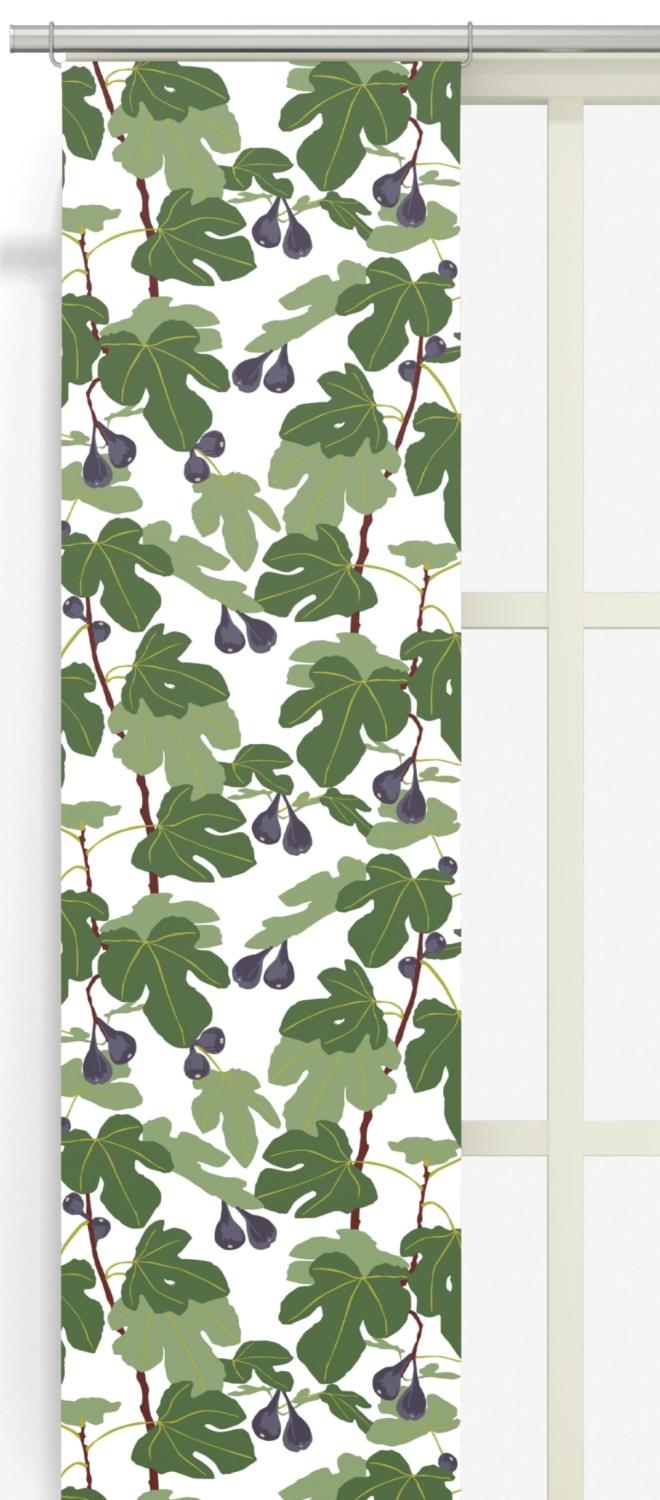 Panelgardin Fikonträd från Arvidssons Textil, designad av Björk Forth, är tillverkad i bomull med ett vackert mönster av fikonblad i olika gröna nyanser och fikon i små klasar på ljus botten. Panelgardinens naturnära design gör att den passar perfekt i vardagsrum, kök eller uterum för en lugn och harmonisk atmosfär. Overlock nedtill. Storlek: 43x240 cm. Säljes i 2-pack.