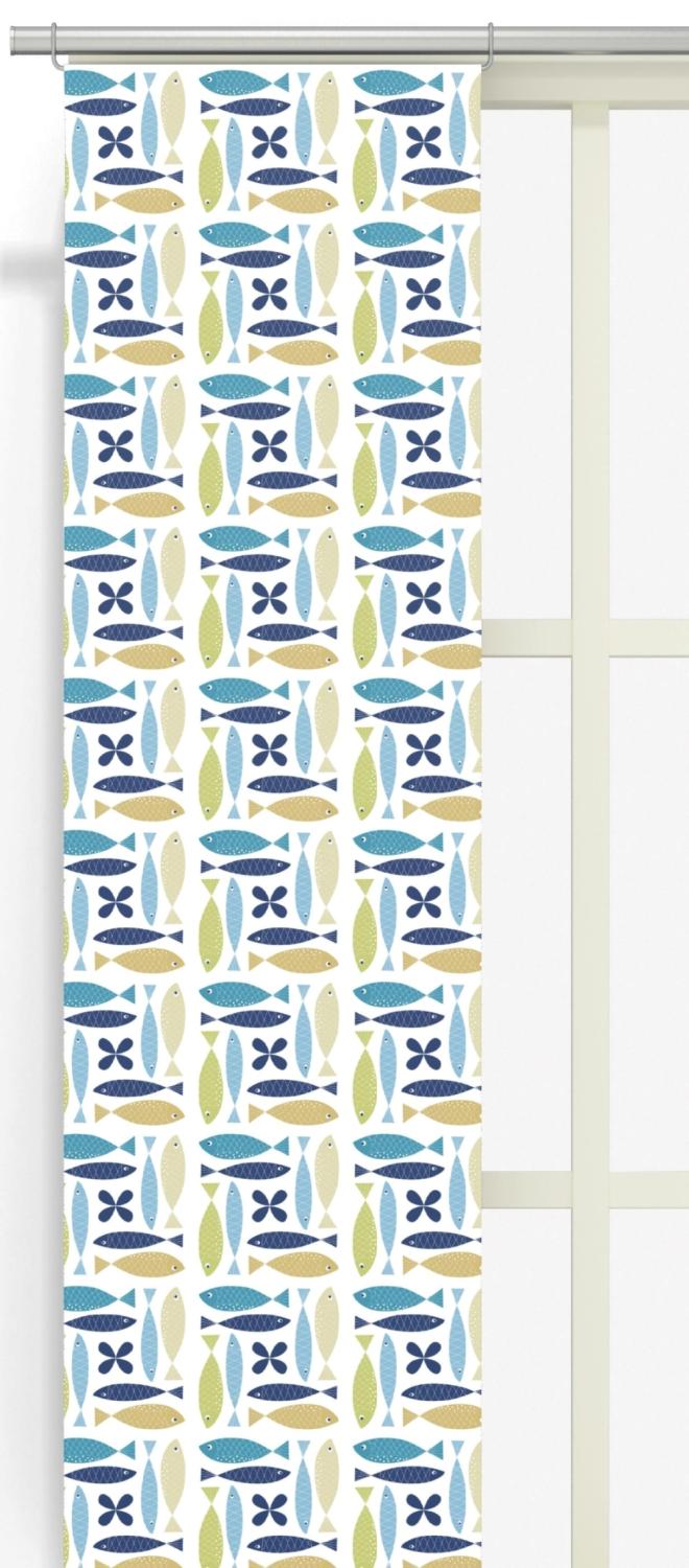 Panelgardin Fina Fisken från Arvidssons Textil har en charmig och lekfull design med fiskar i en harmonisk palett av turkost, mörkblått och beige. Den grafiska designen mot den vita botten skapar en ombonad känsla och ger rummet karaktär.