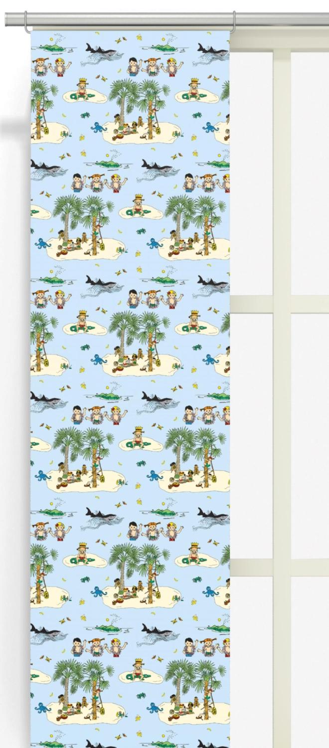 Panelgardin Kurrekurreduttön från Arvidssons Textil i 100% bomull har ett lekfullt och äventyrligt motiv inspirerat av Pippis värld. Här möter du Tommy och Annika bland öar, hajar och palmer mot en blå botten som för tankarna till spännande äventyr.