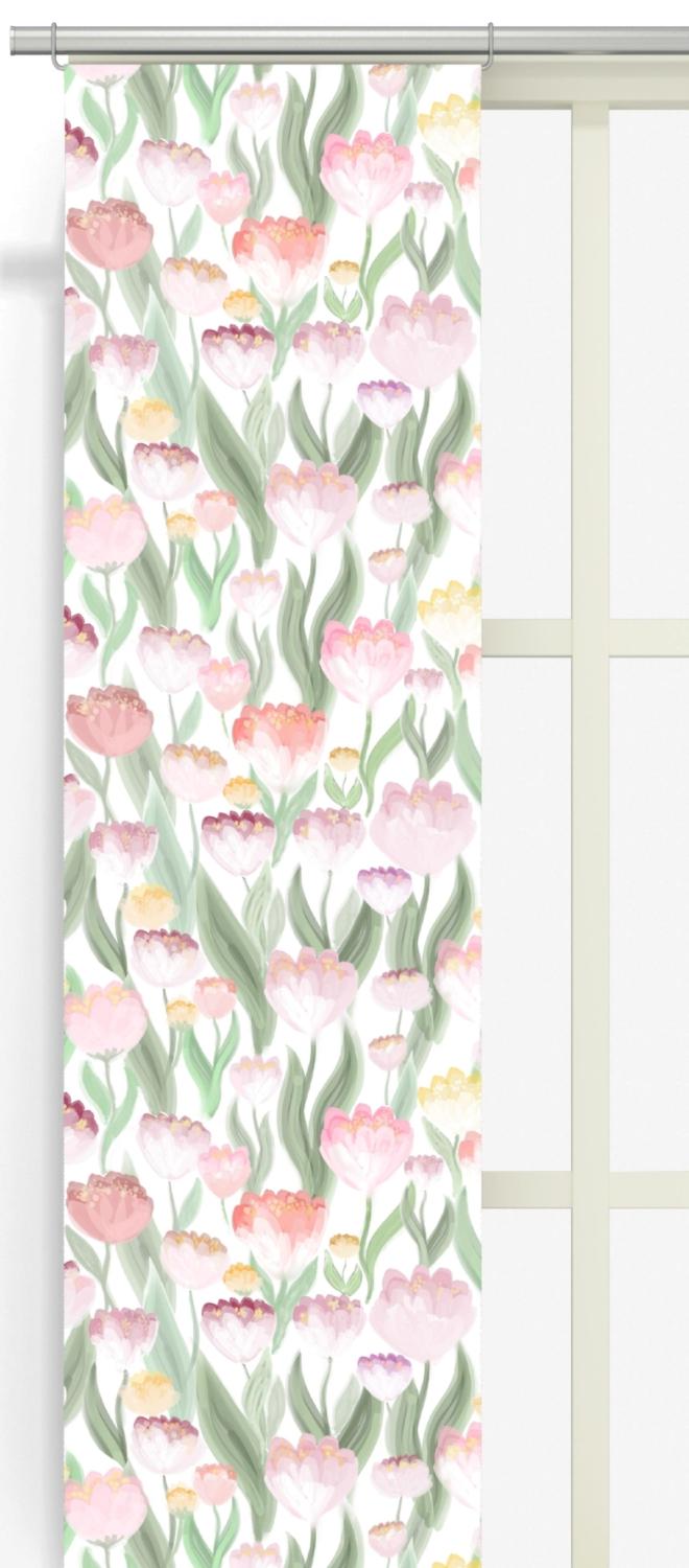 Panelgardin Ljuvligt från Arvidssons Textil i bomull har ett vackert blommönster med tulpaner i olika storlekar och gröna blad. De mjuka formerna och de långa bladen skapar ett levande och harmoniskt uttryck med en fin känsla av höjd.