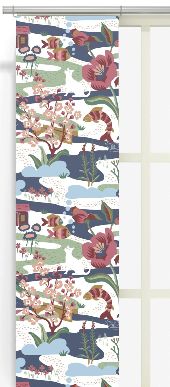 Panelgardin Landet Bubblar från Arvidssons Textil är tillverkad av bomull. Den har ett fantasifullt och sprudlande mönster med fiskar simmandes bland hus, katter och koraller på en svart i vinrött, lavendelblått, vitt och puderrosa. Panelgardinen passar vuxna som barn och i alla interiörer. Design: Hanna Werning. Overlock nedtill. Storlek: 43x280 cm Säljes i 2-pack.
