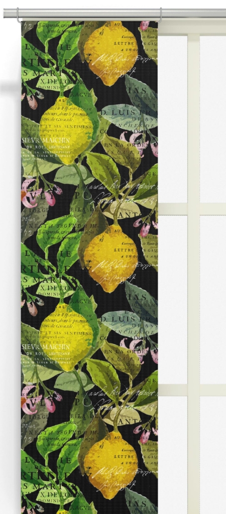 Panelgardin Citrus är designad av Arvidssons Textil är tillverkad i bomull och har ett härligt och somrigt mönster med gula citroner och gröna blad mot en svart bakgrund. En fin detalj som för in en underbar sommarkänsla och en charmig känsla till rummet. Panelgardinen har en tryckt text som förstärker det charmiga och personliga uttrycket. Overlock nedtill. Storlek: 43x240 cm. Säljes i 2-pack.