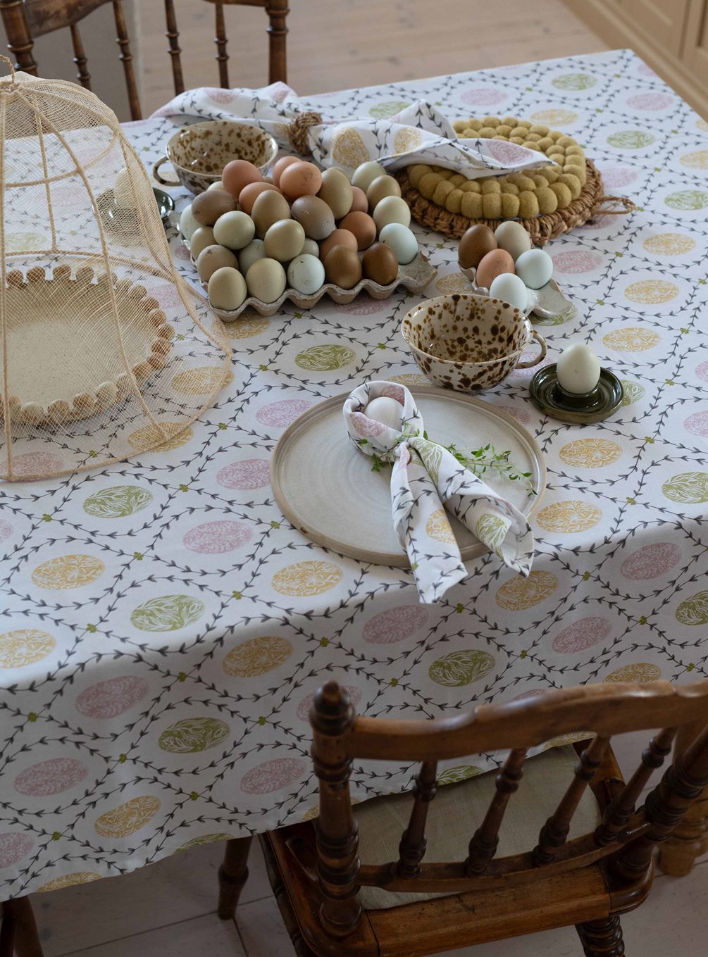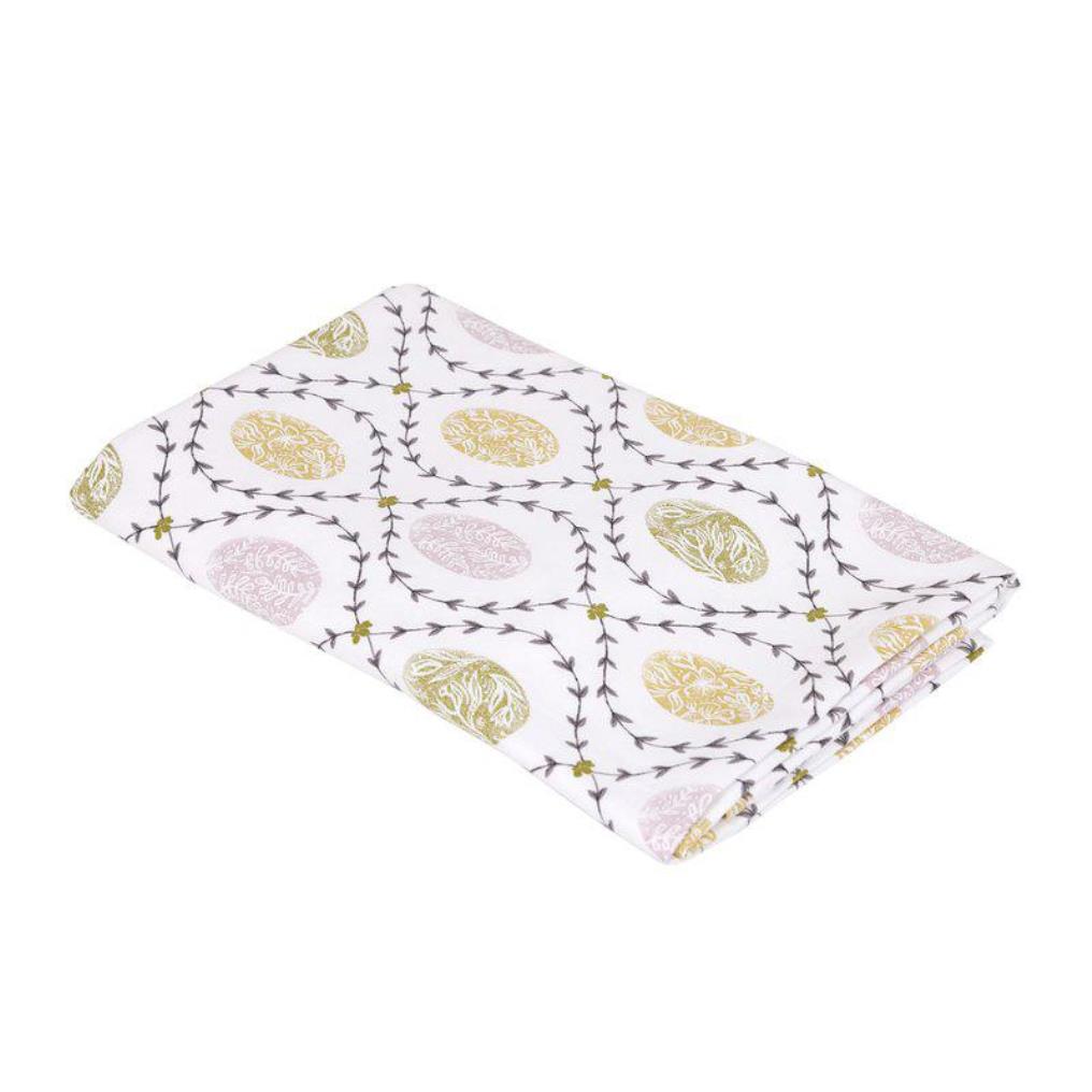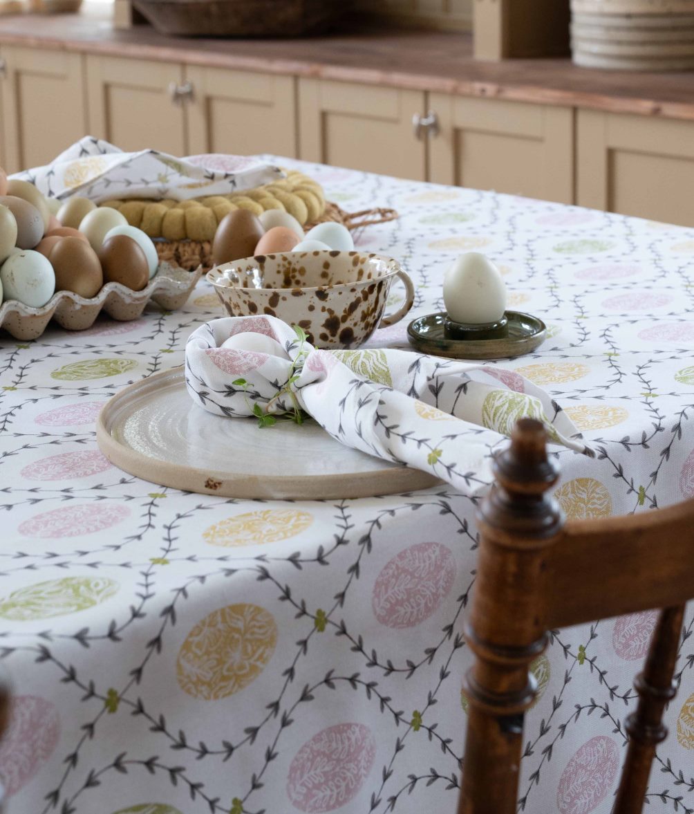 Bordsduk Agda från Fondaco är en ljuvlig påskduk i 100% bomull som sprider glädje och färg kring bordet. Duken har ett klassiskt mönster med vackert dekorerade påskägg och bladrankor i mjuka pastellfärger mot en vit botten. Den skapar en välkomnande påskstämning i hemmet och blir en charmig detalj som gör varje dukning festlig och inbjudande. Storlek: 140x250 cm.