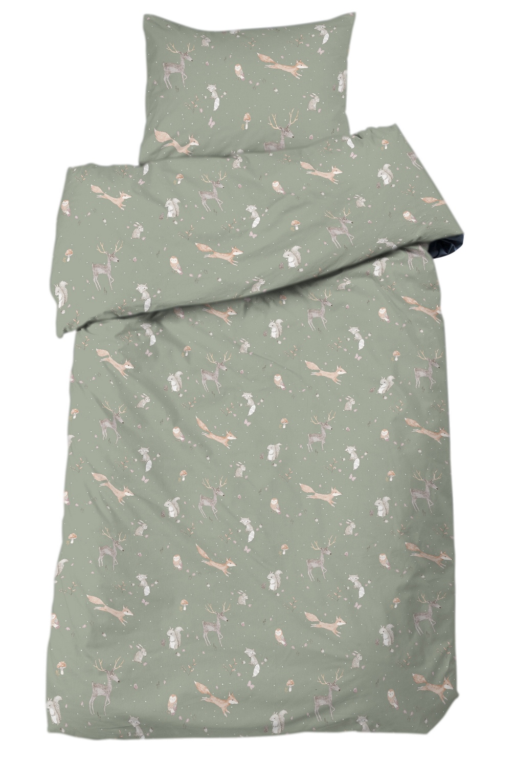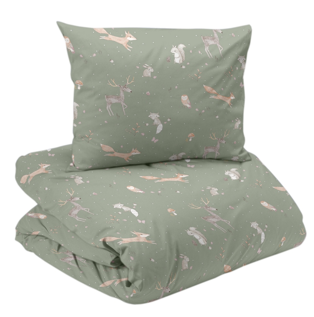Påslakanset Stampe från Redlunds är tillverkat i mjuk bomull och har ett sött mönster med små djur från skogen, som rådjur, rävar och ekorrar. Den dämpade gröna färgen skapar en lugn och mysig atmosfär i barnrummet. Perfekt för att göra barnrummet mysigt, lekfullt och inbjudande. Certifierat enligt OEKO-TEX® STANDARD 100, fritt från skadliga ämnen och producerat enligt Amfori för etiska och rättvisa arbetsvillkor.