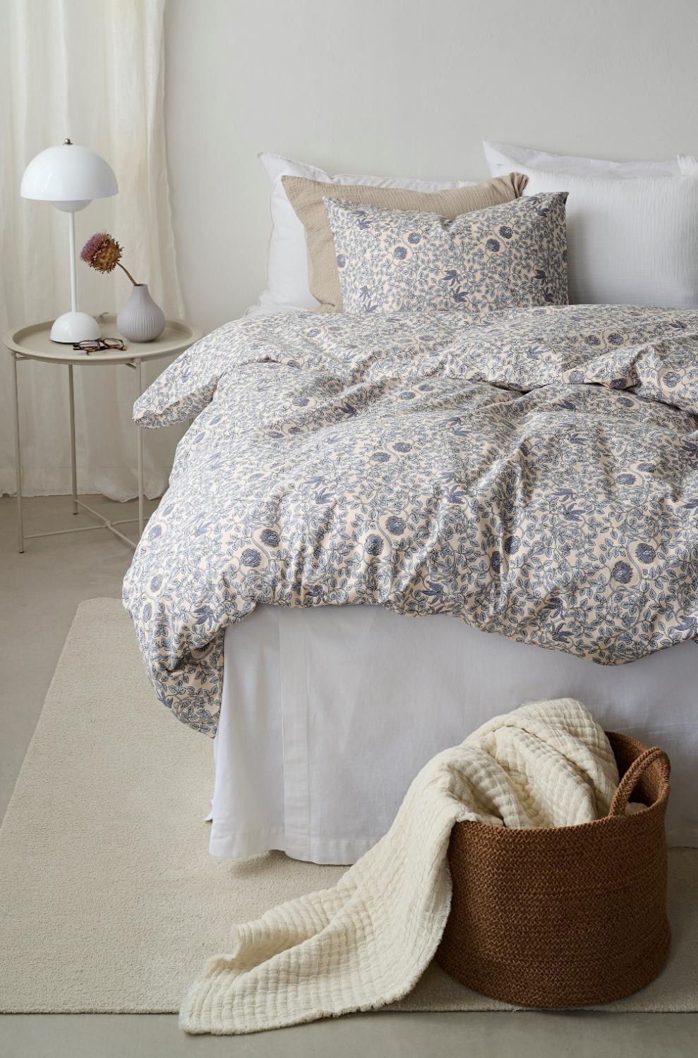 Påslakanset Botanique från Borganäs of Sweden har en vacker och tidlös design. Det vackra mönstret av slingrande grenar och blad i dämpade blå nyanser mot en varm beige bakgrund ger ett elegant och rofyllt uttryck som för tankarna till en klassisk, botanisk trädgård. Setet är tillverkat i 100% mjuk och behaglig bomull som gör bäddningen extra inbjudande. Trådtäthet: 144 TC. Denna tidlösa design är perfekt för dig som vill skapa en harmonisk oas i ditt sovrum.