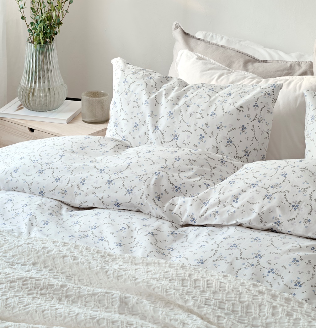 Påslakanset Vilja från Borganäs of Sweden har ett charmigt mönster med små blå blommor på en ljus botten. Det skapar en mysig atmosfär och sprider en romantisk känsla i sovrummet. Bäddsetet har en trådtäthet på 144 TC. Påslakanet har praktiska hörnhål för enkel bäddning och örngott med kuvertöppning.