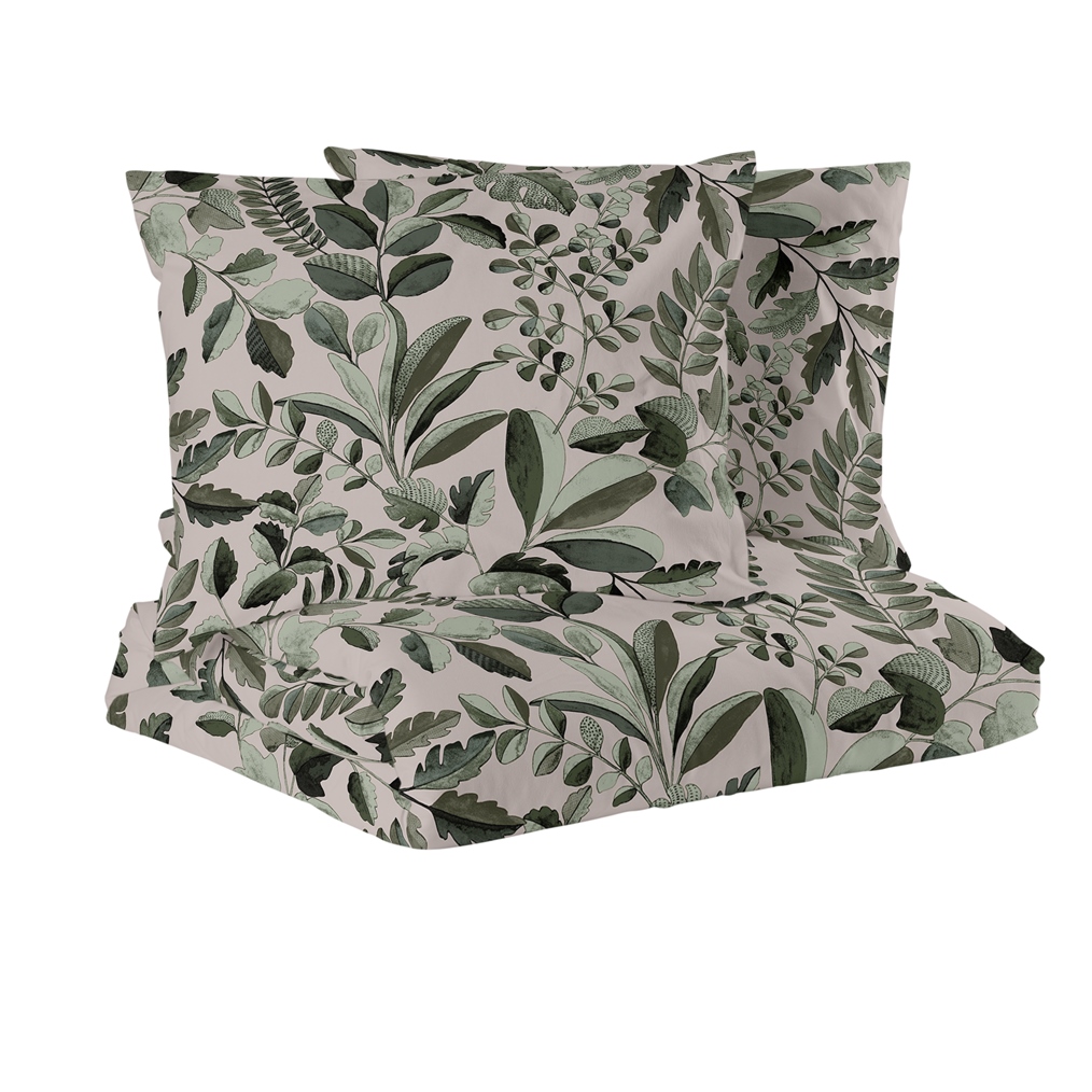 Påslakanset dubbeltäcke Theo från Redlunds är tillverkat i mjuk och skön bomull och har ett vackert mönster av olika blad och ormbunkar. De dämpade tonerna av grönt på en ljus botten skapar en lugn och harmonisk atmosfär som inbjuder till avkoppling. Setet är certifierat enligt OEKO-TEX® STANDARD 100, fritt från skadliga ämnen och producerat enligt Amfori för etiska och rättvisa arbetsvillkor.