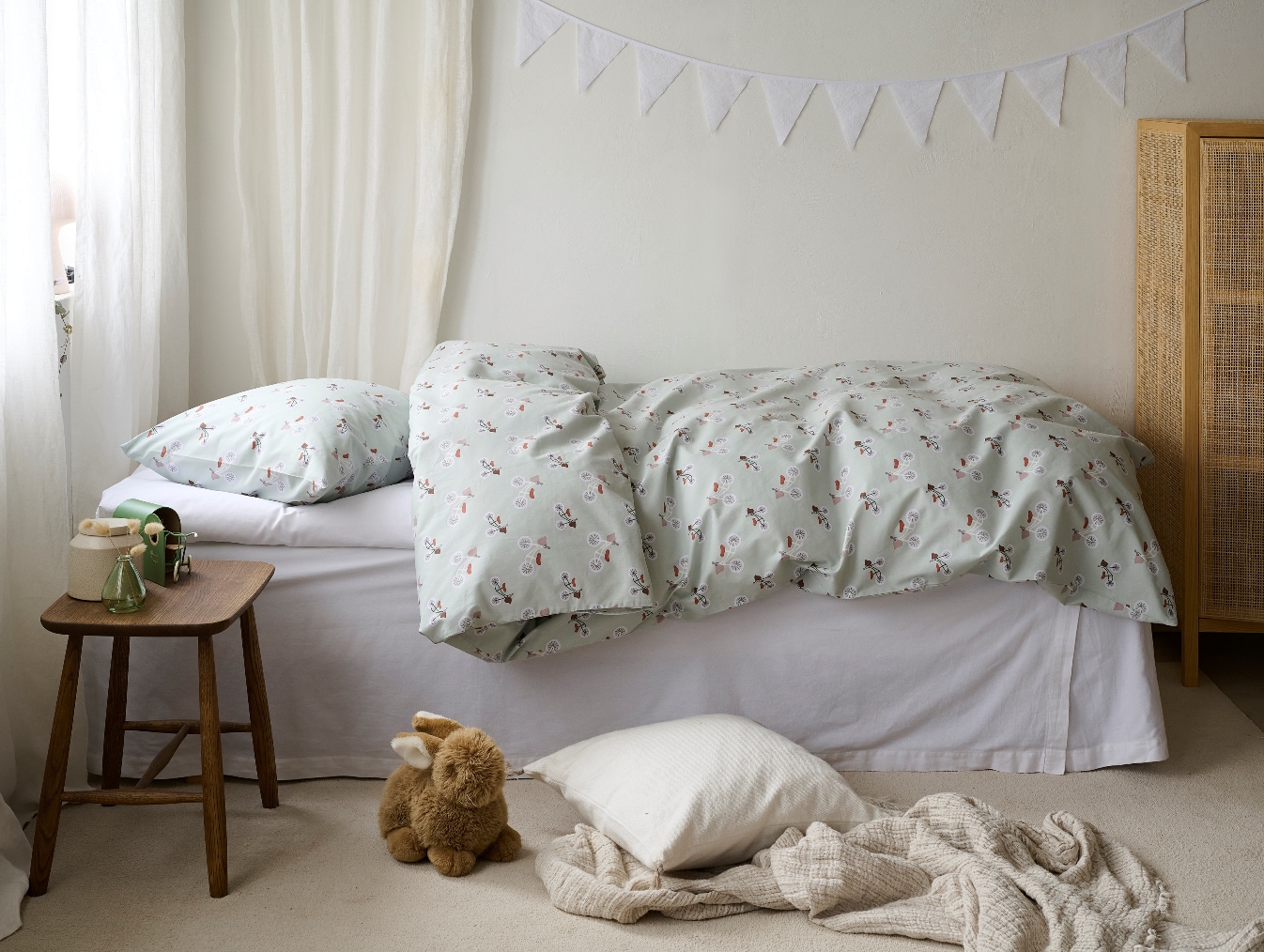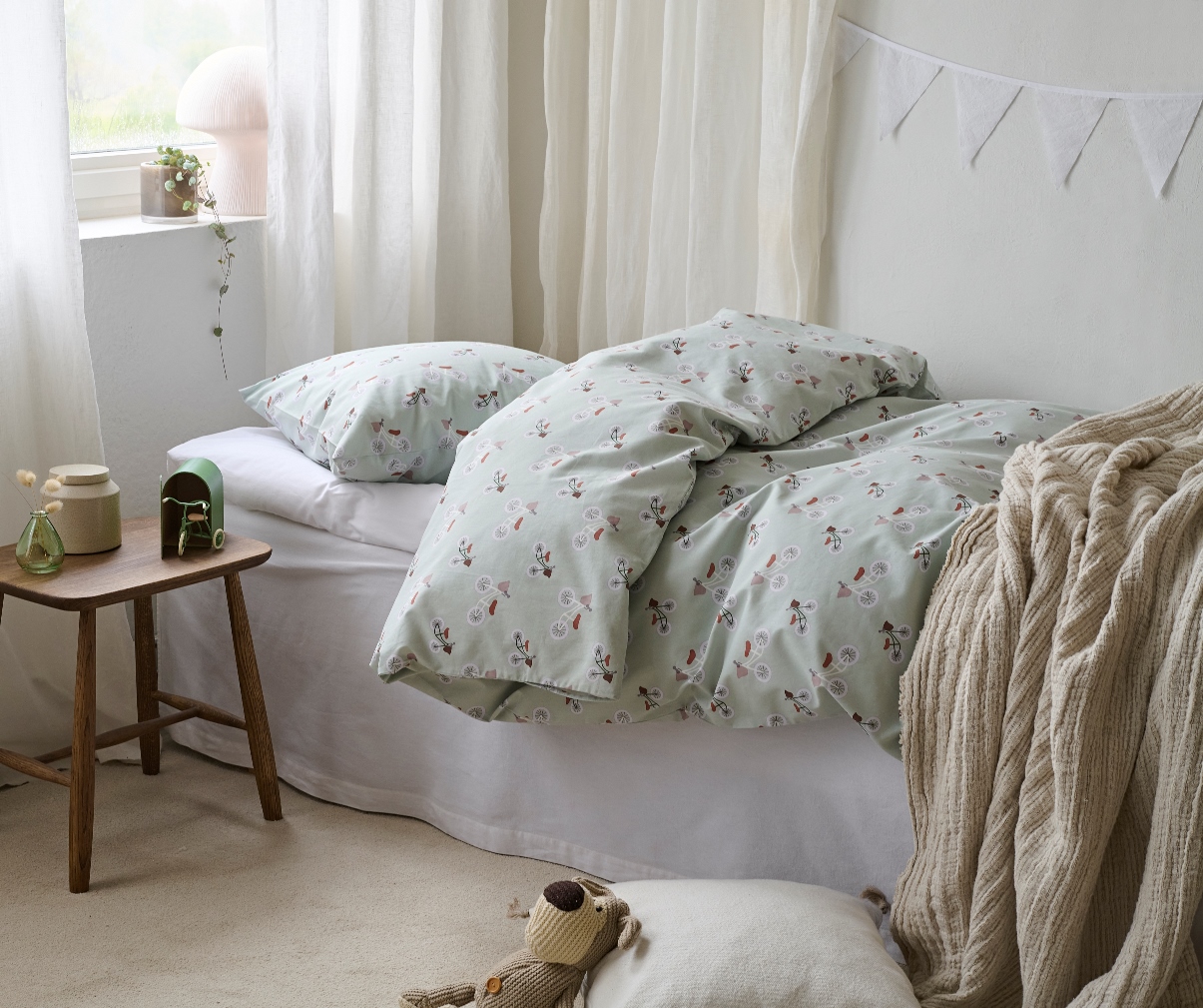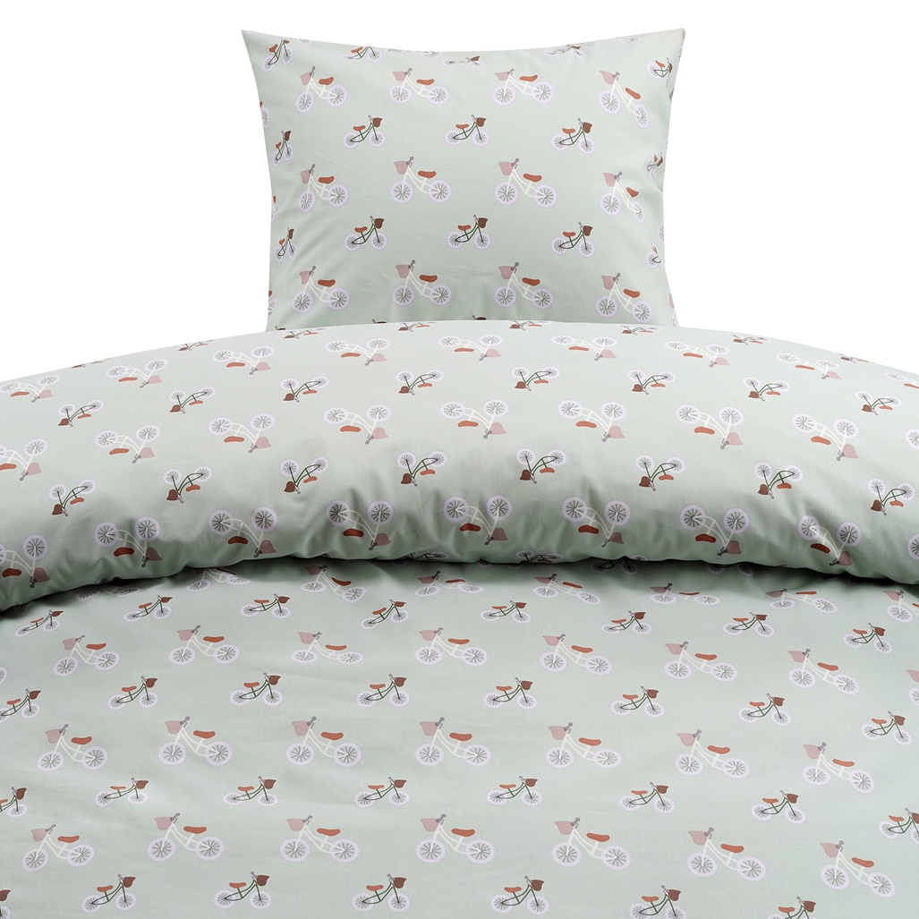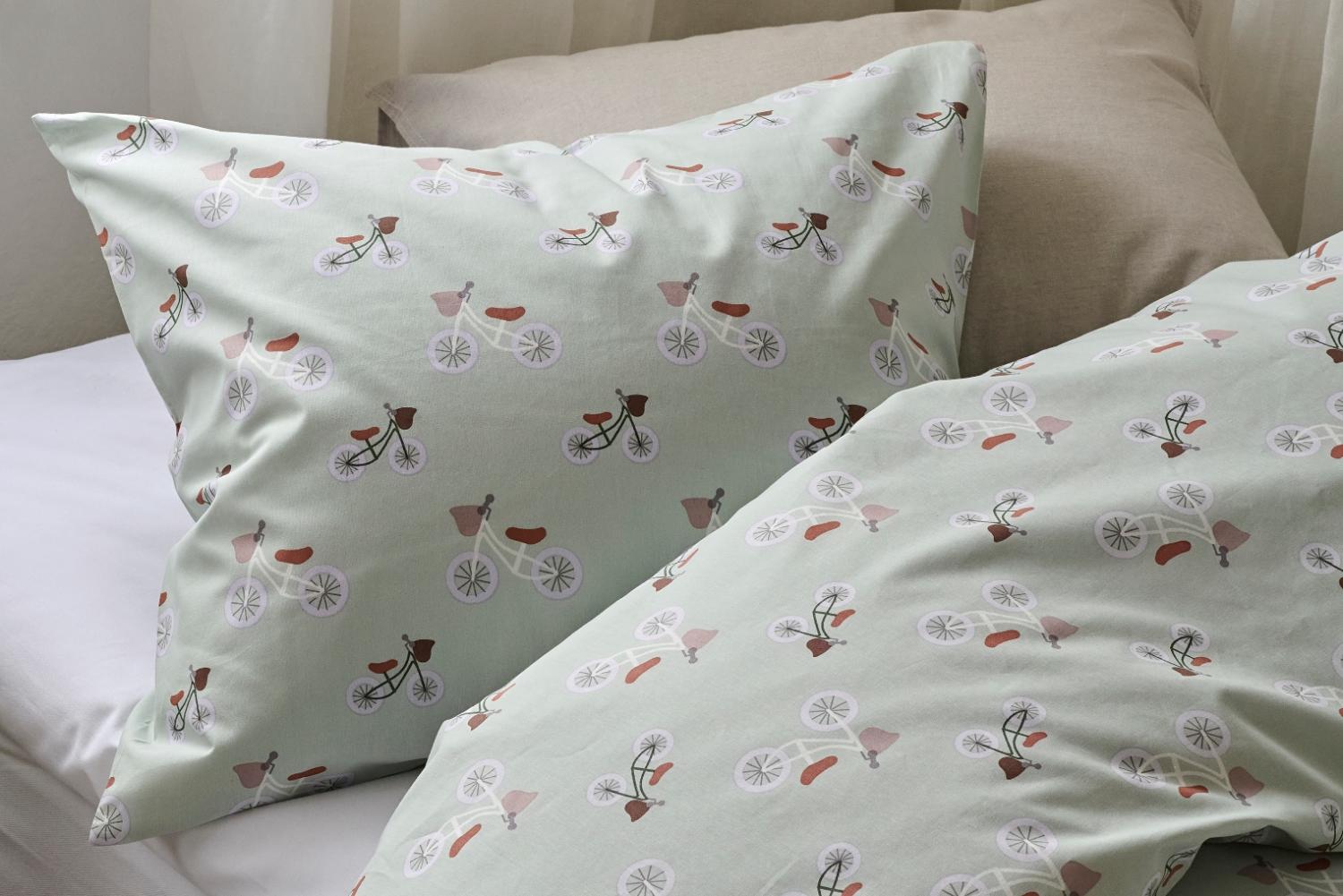 Påslakanset Plingeling från Borganäs of Sweden har ett lekfullt och charmigt mönster av cyklar i olika färger. Mot en mjuk grön botten skapar mönstret en glad och drömsk känsla som passar perfekt i barnrummet.