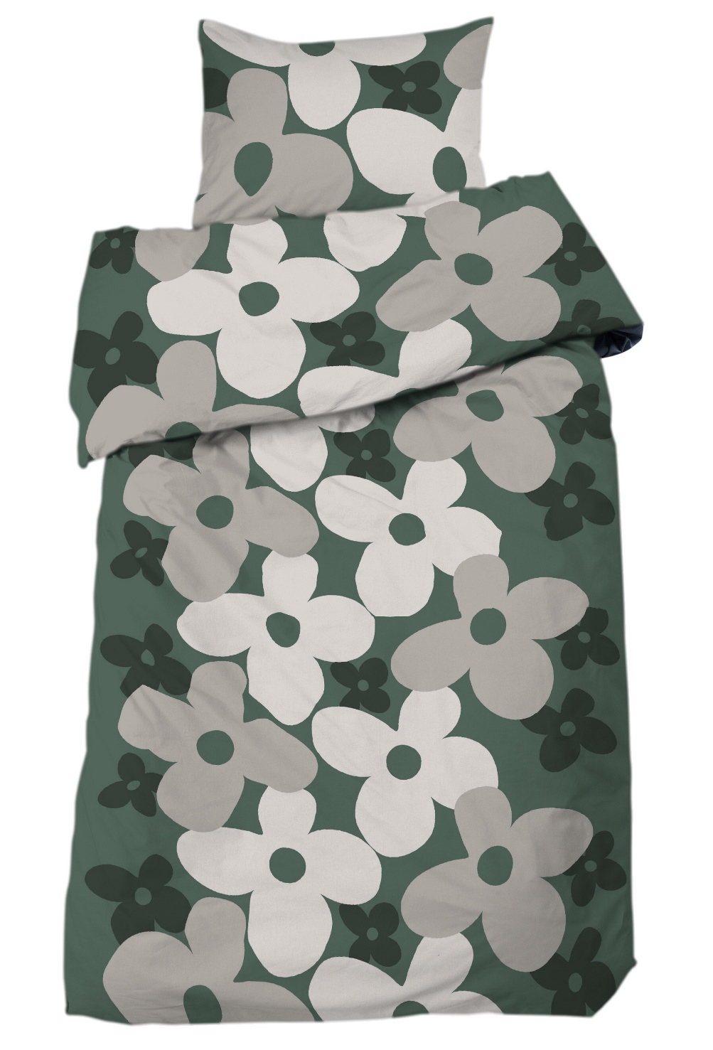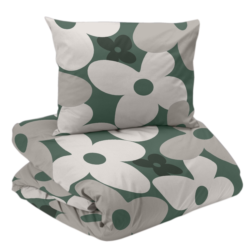 Påslakanset Happy från Redlunds är tillverkat i mjuk och skön bomull och har ett lekfullt, storblommigt motiv. De grafiska blommorna i varma toner av grönt, beige och grått ger en retroinspirerad och inbjudande känsla i sovrummet. Setet kombinerar komfort med stil och blir en färgstark detalj som piggar upp både säng och inredning.