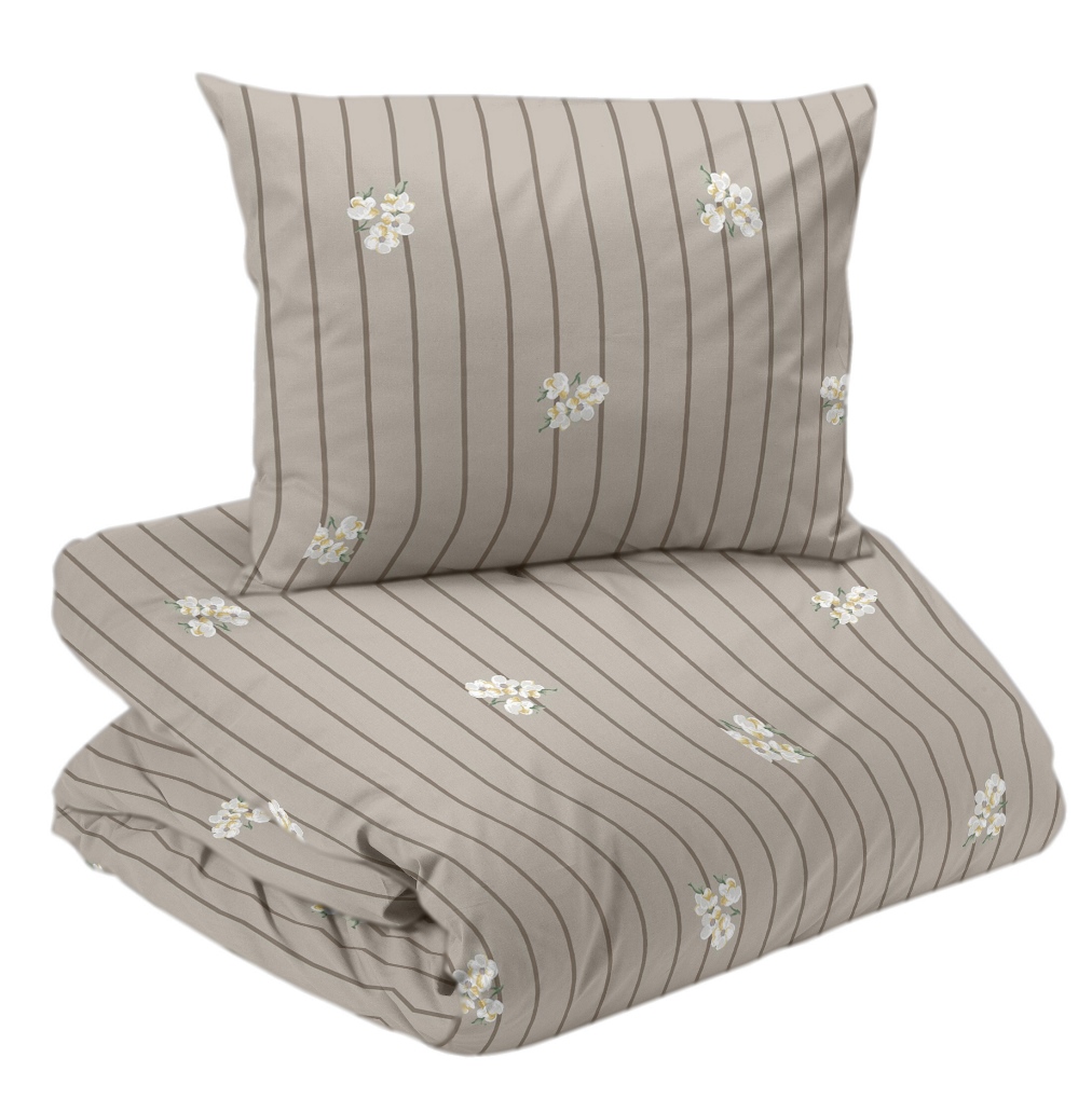 Påslakanset Tove från Redlunds är ett tvådelat set i skön 100% bomull. Bäddsetet har smala, vertikala ränder i en jordnära brun nyans mot en mullvadsfärgad botten. Över ränderna löper ett charmigt mönster av små blombuketter i vitt och blekgult som ger sovrummet en romantisk och lantlig karaktär. Setet har en trådtäthet 120 TC.