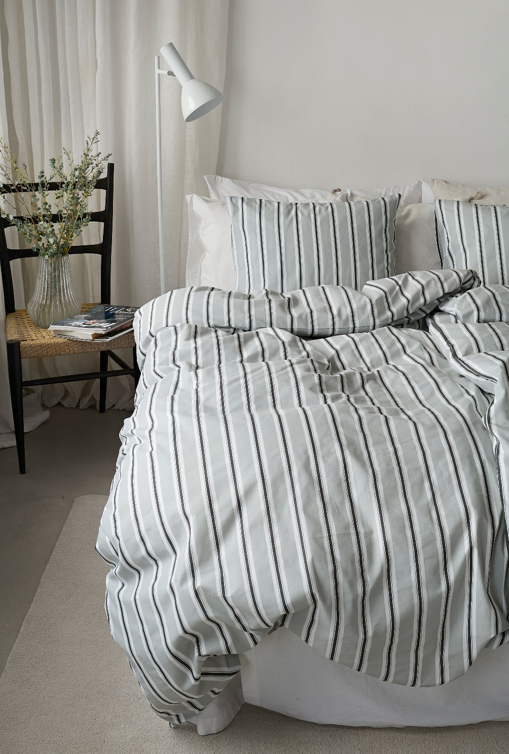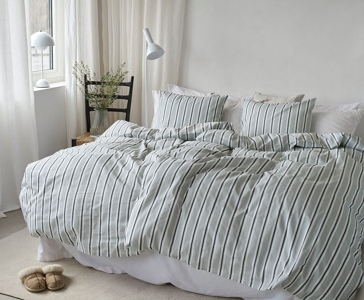 Påslakanset Sunnan från Borganäs of Sweden med fina gröna ränder tillsammans med vitt skapar en härlig kontrast som gör bäddningen både levande och inbjudande. Ett tidlöst val som passar både moderna och klassiska sovrum. Bäddsetet är tillverkat av mjuk bomull med en trådtäthet på 144 TC. Hörnhål för enkel bäddning och kuvertöppning på örngottet.