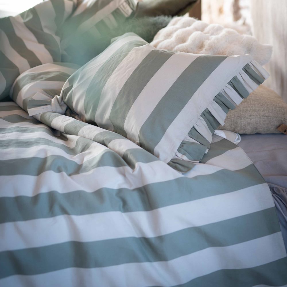 Påslakanset Tove från Fondaco med en elegant design med breda, stilrena ränder i grönt (6,5 cm). Den dova färgkombinationen skapar ett diskret och harmoniskt uttryck i sovrummet. Örngottet är prytt med en 8 cm volang på kortsidorna, en mjuk och dekorativ detalj som ger en ombonad känsla. Tillverkat i mjuk och skön bomull med en trådtäthet på 144 TC.