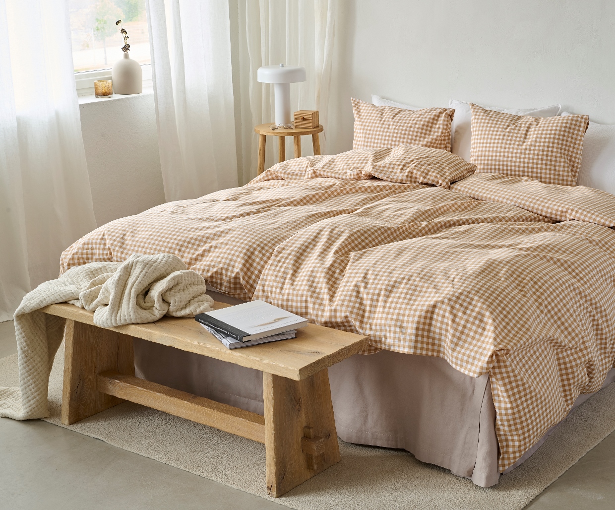 Påslakanset Märta från Borganäs of Sweden har ett klassiskt rutigt mönster som ger en tidlös och lantlig charm till sovrummet. De små, jämna rutorna i en mjuk gul nyans mot en vit bas skapar en varm och hemtrevlig känsla.