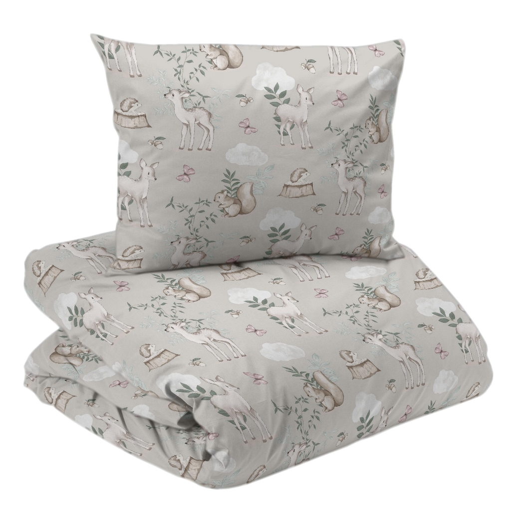 Påslakanset Bambi från Redlunds för spjälsäng är tillverkat i mjuk och skön 100% bomull. Bäddsetet har ett gulligt naturinspirerat mönster på en beige botten som skapar en harmonisk känsla i barnrummet. Det lekfulla mönstret blir en fin detalj i barnrummet. Setet, som har en trådtäthet på 120 TC.
