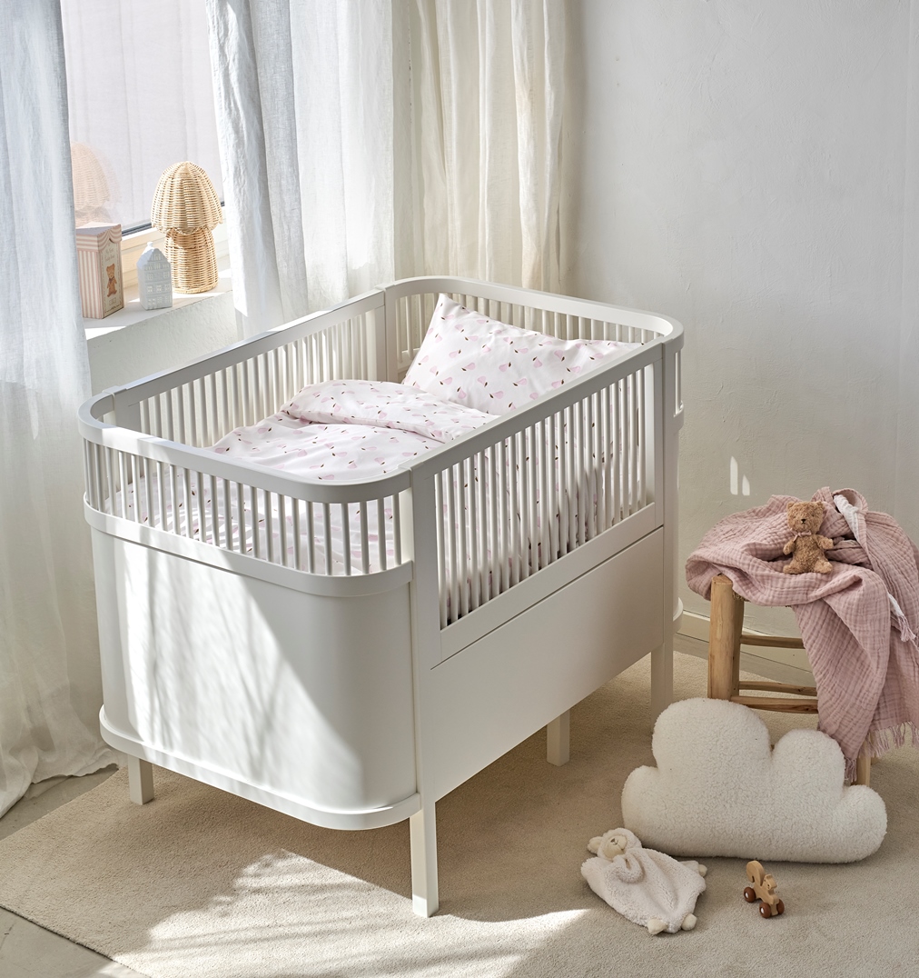 Påslakanset Päron för spjälsäng från Borganäs of Sweden i mjuk bomull med ett lekfullt mönster av små rosa päron med bruna stjälkar, tryckta mot en vit bakgrund. Designen är både söt och stilren, vilket gör att det passar perfekt i ett barnrum. Bäddsetet ger en fräsch och charmig känsla och blir ett fint blickfång tack vare det söta päronmönstret.