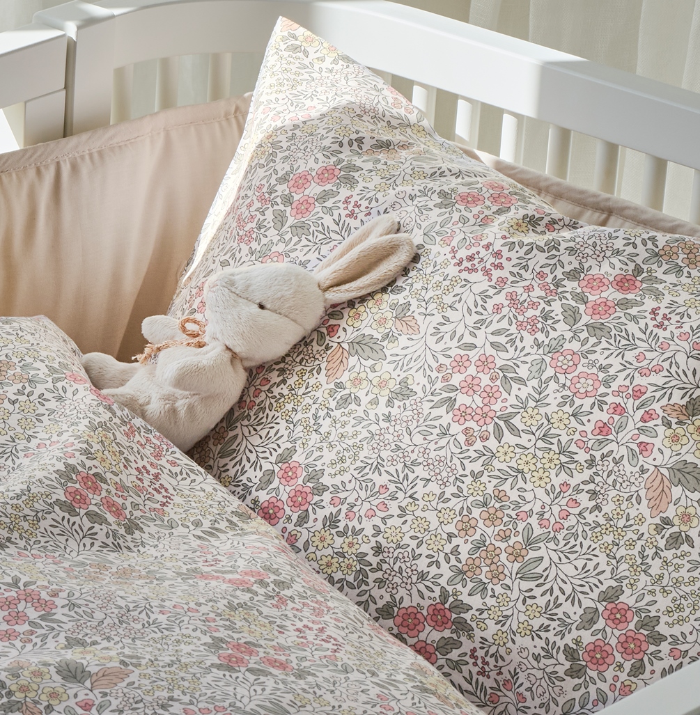 Påslakanset Floret för spjälsäng från Borganäs of Sweden har ett vackert mönster av små blommor och blad. De mjuka pastellfärgerna i rosa, grönt och gult mot en ljus, sandfärgad botten skapar en romantisk och tidlös charm i barnrummet.