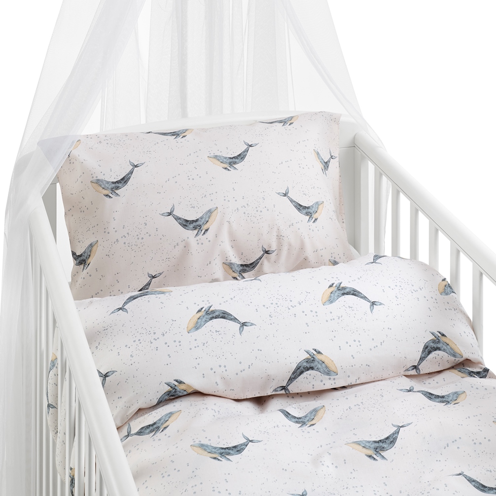 Påslakanset Valsång för spjälsäng från Borganäs of Sweden är designat för att ge barnrummet en mjuk, marin känsla. Det milda mönstret med simmande valar i dämpade blå och grå toner mot en ljus, puderrosa bakgrund skapar en lugn och rogivande atmosfär i spjälsängen. Detta bäddset är tillverkat i mjuk och hållbar bomull och har en trådtäthet på 144 TC.