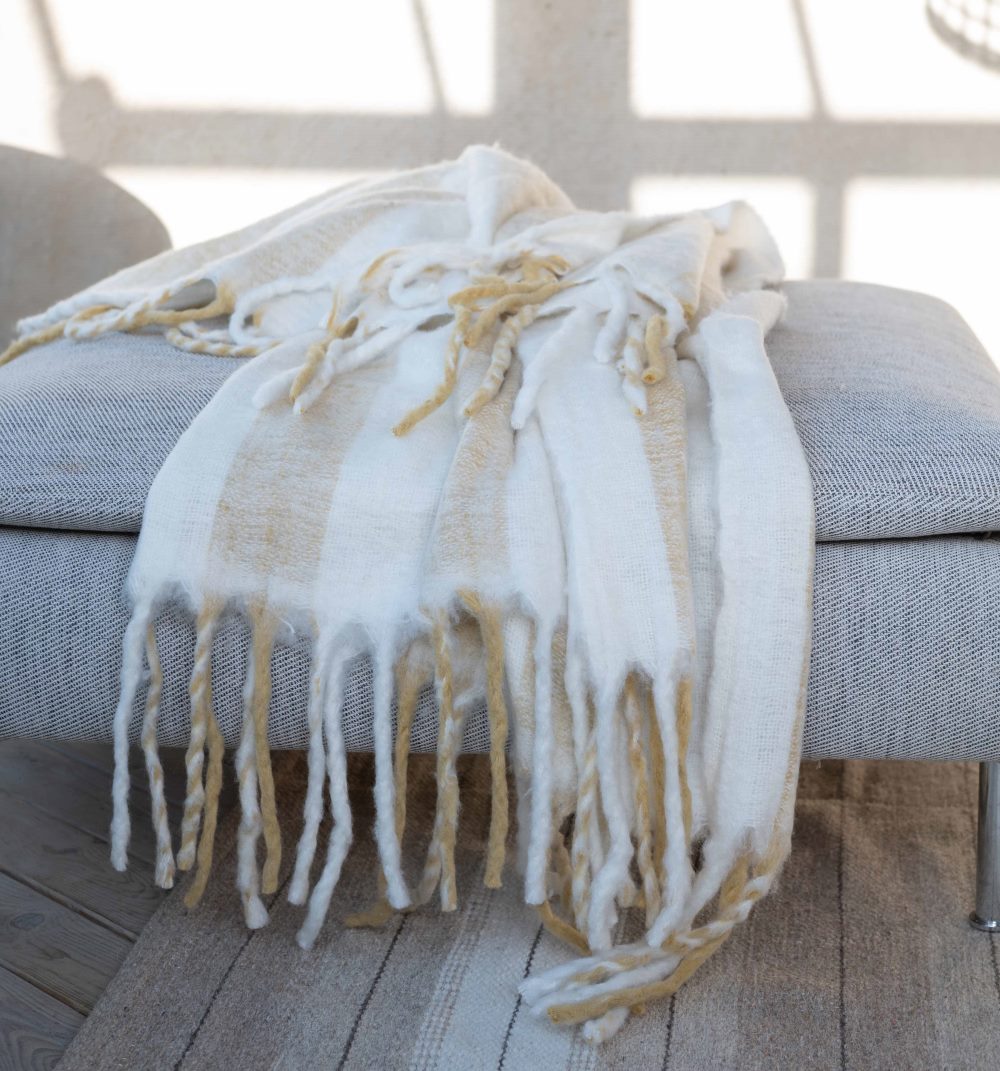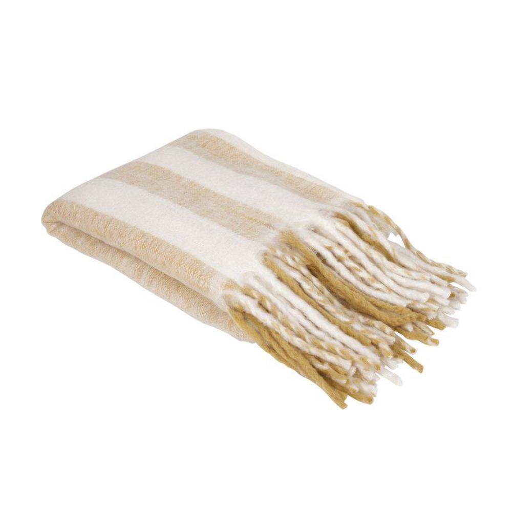 Pläd Mia från Fondaco är en fluffig och gosig pläd med breda ränder i gult och ljusa nyanser som ger ett mjukt och harmoniskt intryck. Den är tillverkad i en behaglig mix av akryl och ull, där akrylfibrerna bidrar till att pläden behåller sin form och mjukhet över tid, medan ullen ger en naturlig värme och en lyxig känsla.