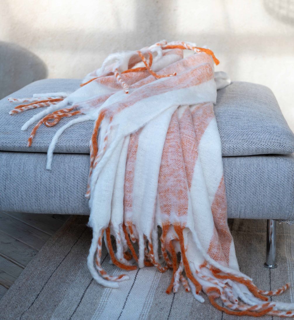 Pläd Mia från Fondaco är en fluffig och gosig pläd med breda ränder i orange och ljusa nyanser som ger ett mjukt och harmoniskt intryck. Den är tillverkad i en behaglig mix av akryl och ull, där akrylfibrerna bidrar till att pläden behåller sin form och mjukhet över tid, medan ullen ger en naturlig värme och en lyxig känsla.