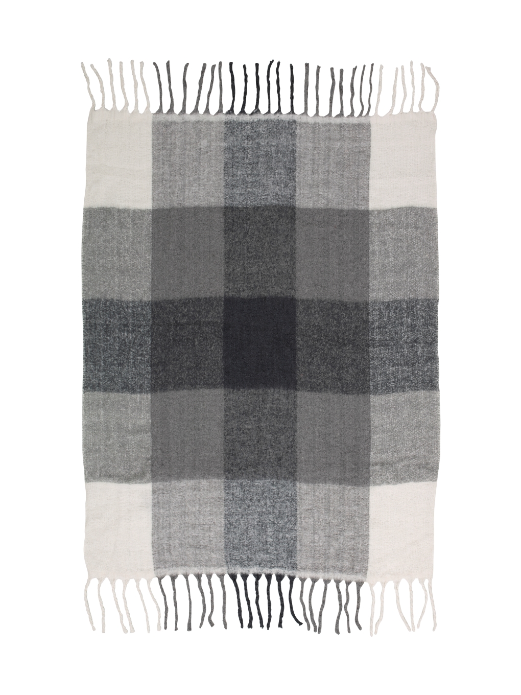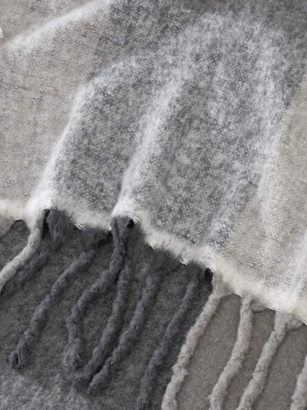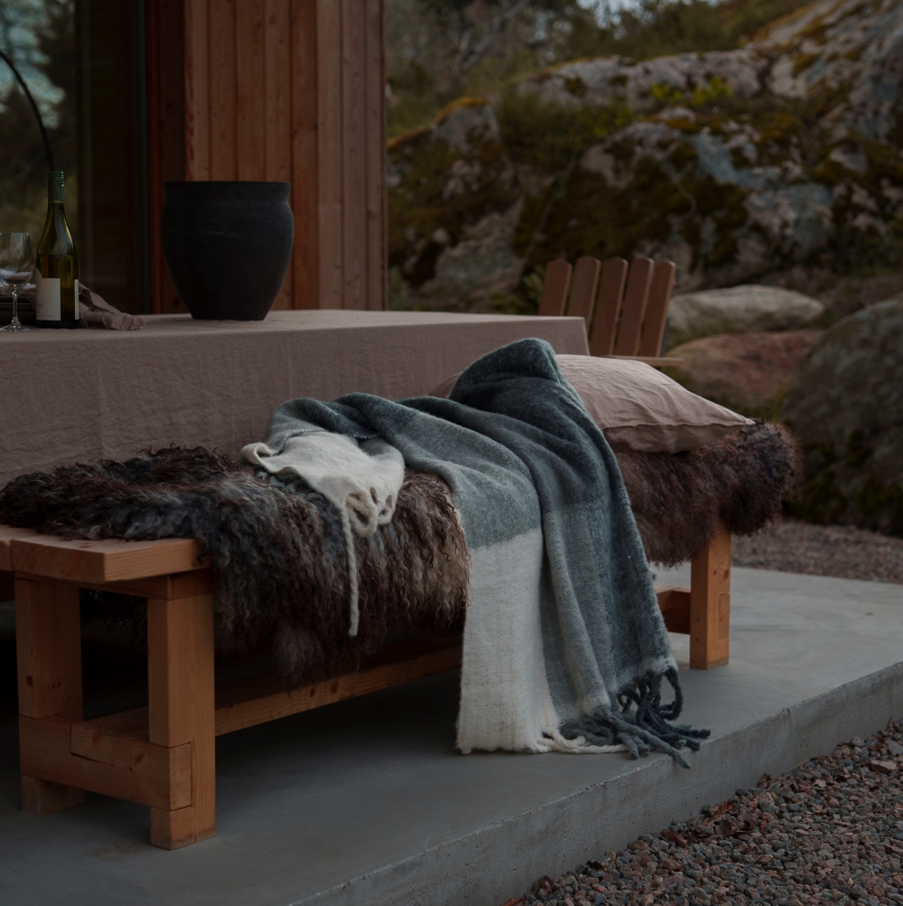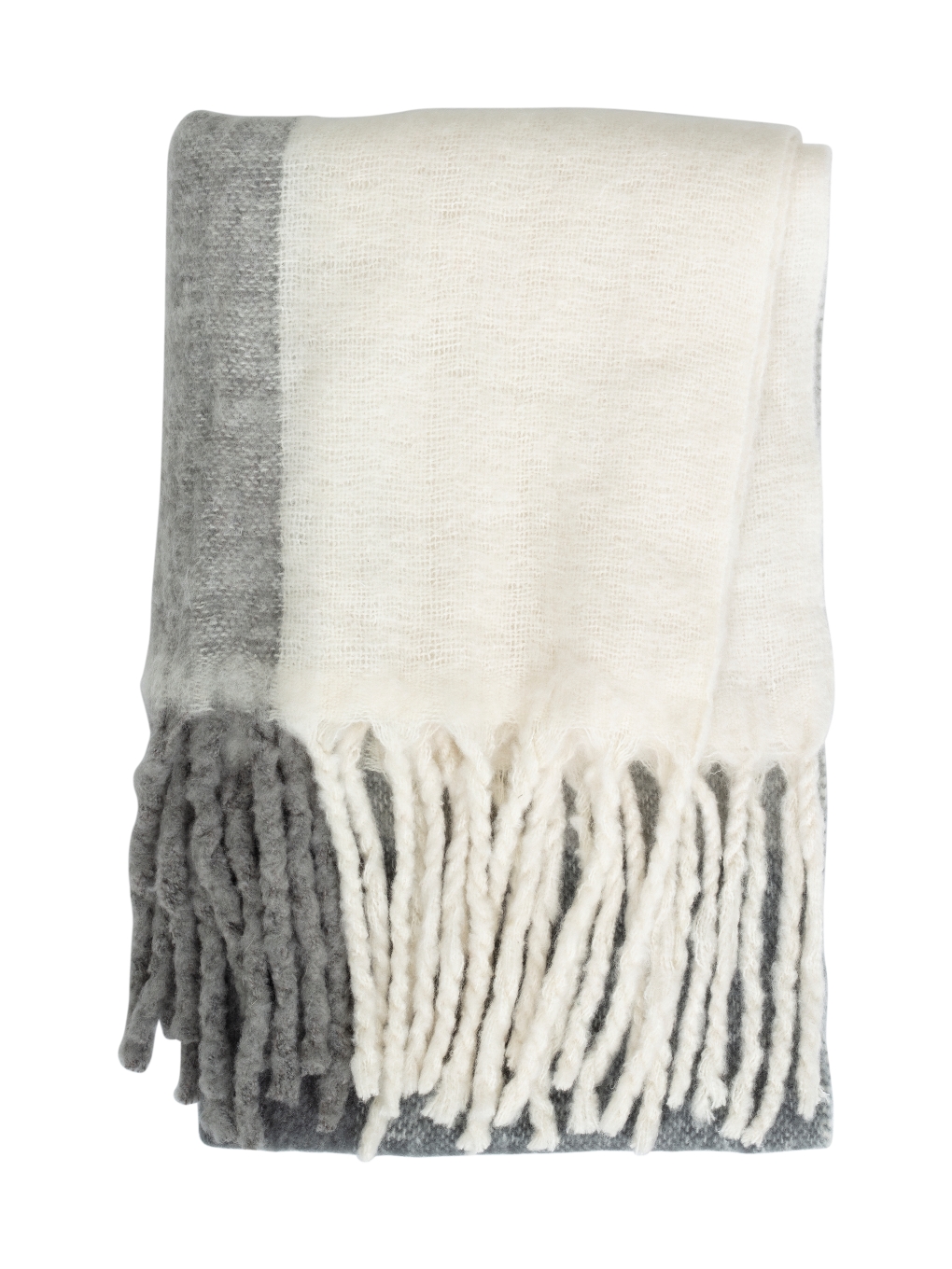 Pläd Varekil från Kosta Linnewäfveri i olika nyanser av grått och vitt/off-white, vilket skapar ett lugnt och sofistikerat intryck i alla rum. Den är tillverkad i en mjuk och skön ullblandning som värmer effektivt under kyliga kvällar, oavsett om du sitter i soffan eller på altanen. Plädens tjocka fransar tillför en elegant detalj, och den är perfekt att svepa om sig under kalla vinterkvällar.