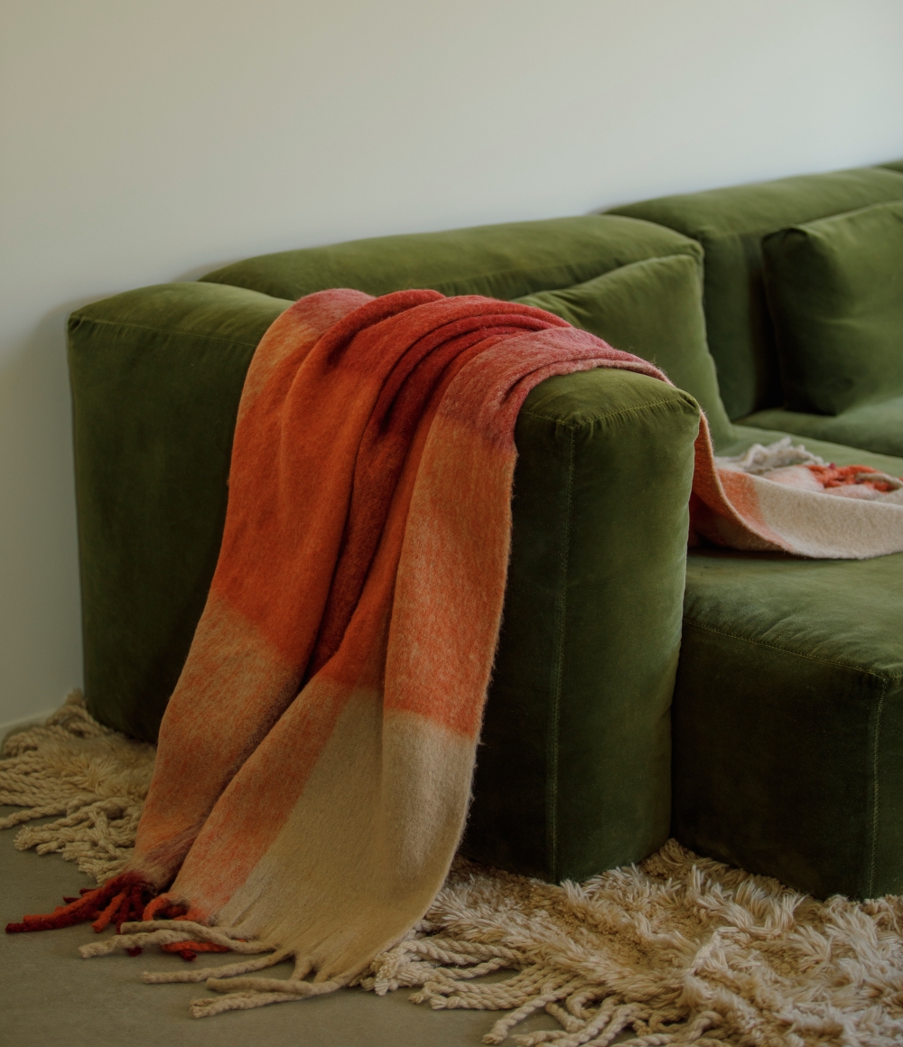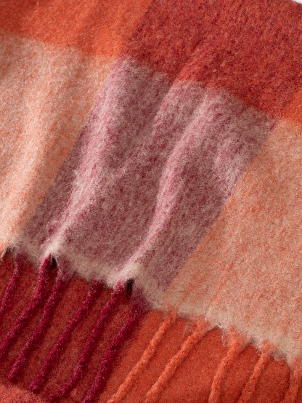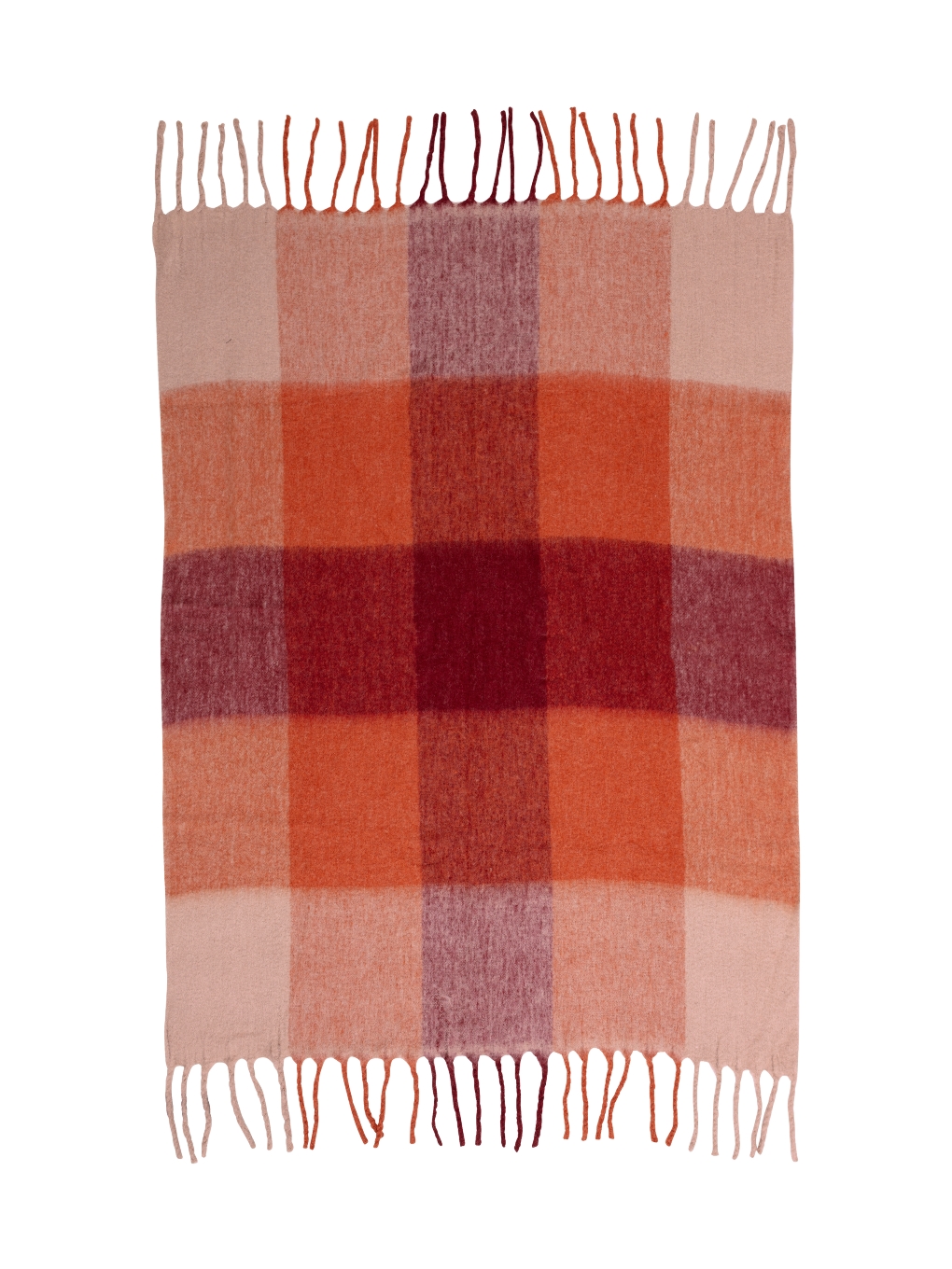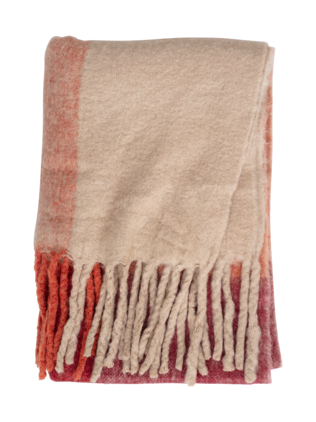 Pläd Varekil från Kosta Linnewäfveri i varma nyanser av rött, vinrött och orange, vilket skapar en ombonad känsla. Den är tillverkad i en mjuk och skön ullblandning som värmer effektivt under kyliga kvällar, oavsett om du sitter i soffan eller på altanen. Plädens tjocka fransar tillför en elegant detalj, och den är perfekt att svepa om sig under kalla vinterkvällar.
