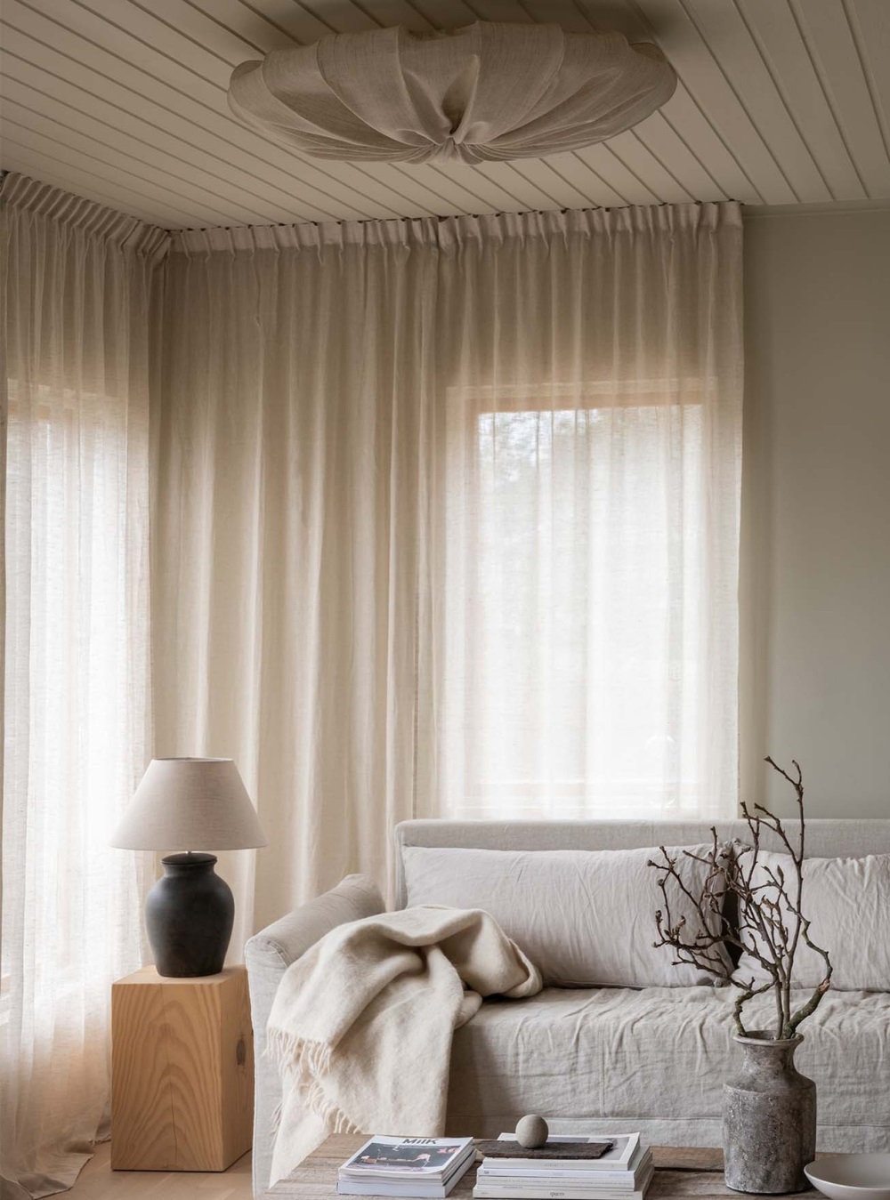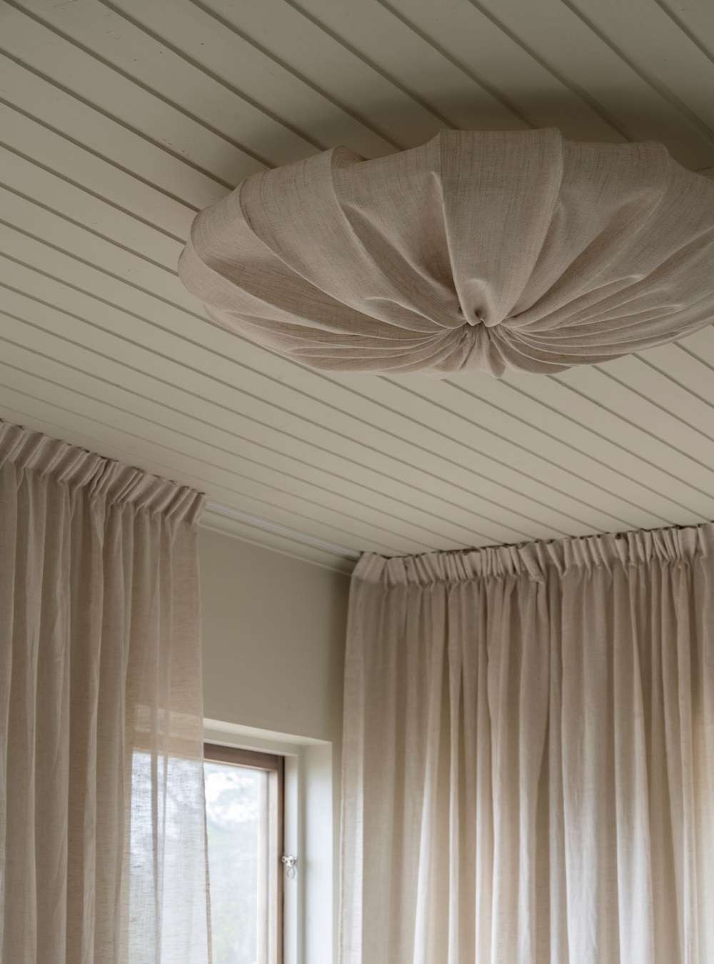 Plafond Anna från Watt & Veke i naturfärgat linnetyg har en härlig textur och en nätt, elegant form som liknar en diskret blomma i taket. När plafonden är släckt framstår den som en stor, mjuk tygskulptur, men när de fyra ljuskällorna tänds silas ljuset vackert genom linnetyget.