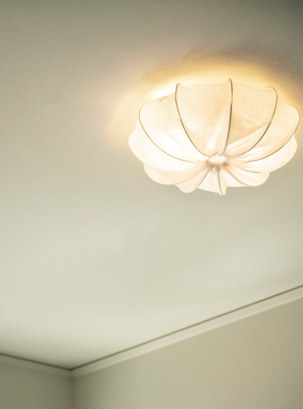 Plafond Anna från Watt & Veke har en vacker design i vitt linnetyg och en mjukt böljande form som sprider ett varmt och behagligt sken. Den nätta designen gör plafonden idealisk för hallen, walk-in-closeten eller andra mindre utrymmen där en hängande modell inte får plats.