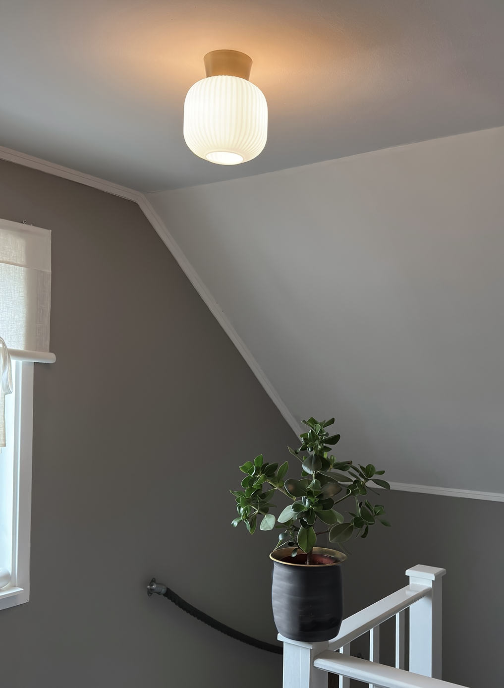 Plafond Vanja från Aneta Lighting med vacker design i räfflat vitt glas med matta mässingsfärgade detaljer i metall som ger ett mjukt och stämningsfullt ljus. Den nätta designen gör den perfekt i små rum där du vill ha både stil och bra ljus. Till plafonden rekommenderas en ljuskälla med en E27 sockel, max 40W. Ljuskälla ingår ej.